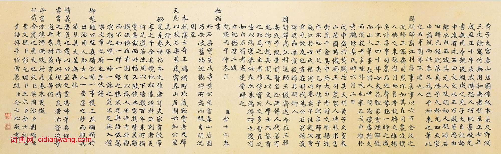 戊申歲。於黃鸝坊某氏。閱黃子久富春山居圖。時儼齋王司農家人持卷求售。索直千金。吳中無大力者。將之維揚。後亦不知所之矣。乙卯秋。予寓京師。程子蓴江於安氏借得此卷。邀予往觀。不啻重見故友也。畫在明代。為白石翁物。後歸樊節推。最後歸吳明卿。入國朝歸高江村。後歸王儼齋。迄今在三韓安氏。予既幸前賢名跡。流傳人代。若有鬼物呵護其間。又以文人學士。不能有之。而為之主者。惟侈寶玩之多。賈直之重。以為豪舉。此卷亦未為得所也。後有如白石翁者。或更當歸之。右沈德潛二跋。乾隆丙午仲冬月。臣金士松奉勅補書。