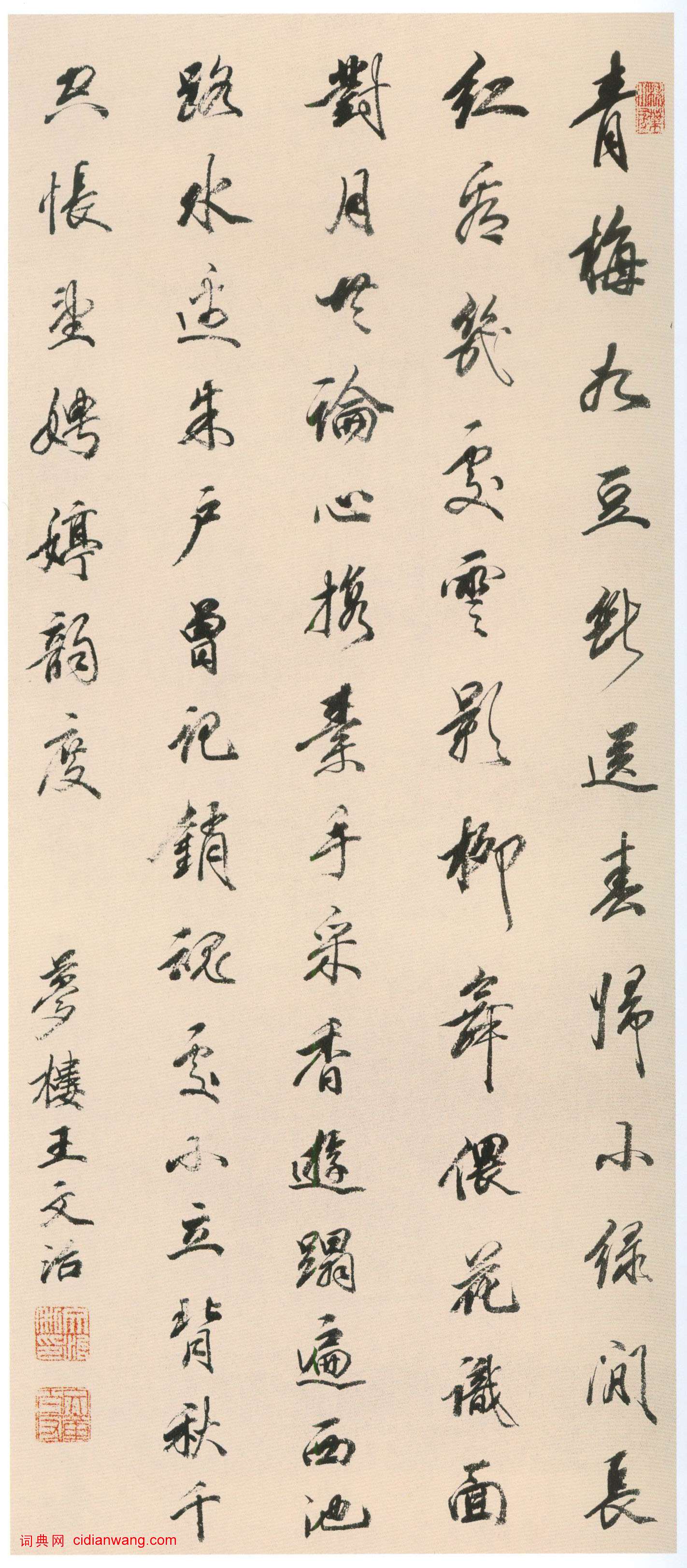 釋文:青梅如豆,斷送春歸。小綠間長紅,看幾處、雲歌柳舞。偎花識面,對月共論心,攜素手,采香游,踏遍西池路。