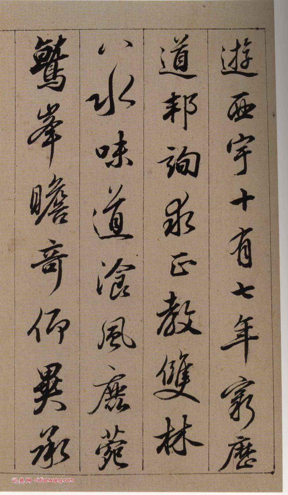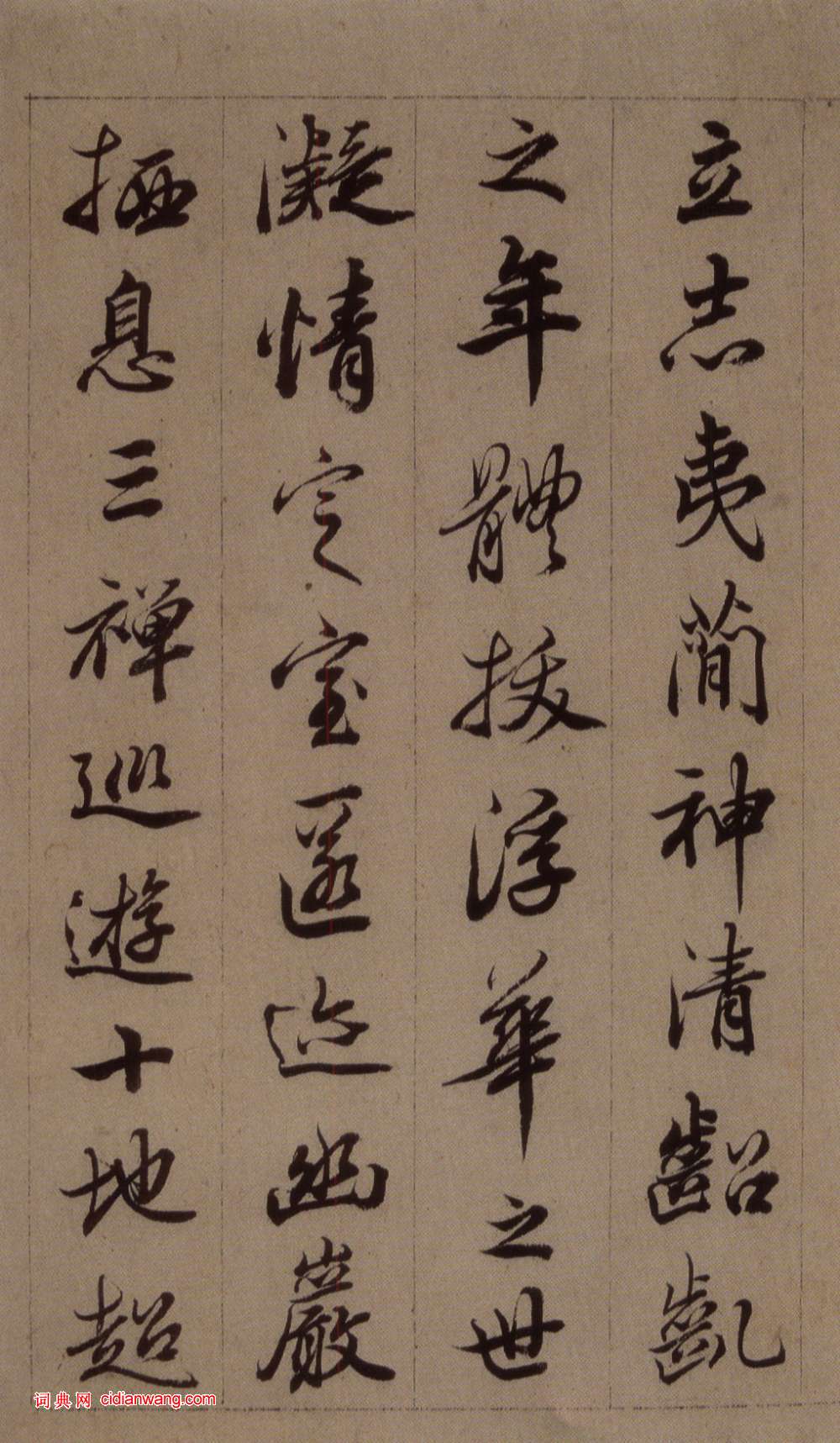 查升此臨本筆致極為靈動飄逸,緊緊扣住“秀”字鋪展開來,結字上基本忠實於原作,再現了王字的那種灑脫自然的風神,書寫時的行雲流水般的一氣呵成,避免了原作集字的局限,顯得渾然一體,仿佛天成。查升用筆極為精熟,幾無敗筆,筆勢往來綿綿不絕,上下貫通,左呼右應,極盡筆墨之妙,婉而通,通而靈,靈而妙,妙而神,有賞心悅目之感誠非虛言。寫王字的難度在於靈動中要保持一份沉著,自然要存有幾分謹嚴,飄浮輕滑是寫王字的大忌,而查升此作能在飄逸中留得住、把得穩,真令人嘆服。上佳的書法作品能在筆勢動作中汩汩流溢而出一股神韻和清氣,而不僅僅是功力再現,它綜合體現了一個書家的學問修養、胸襟氣度,查升此作給人以清朗俊爽的神采,胸中逸氣撲面而來,我在翻檢《中國書法大辭典》時看到他的另一幅行書聯也有此種特點,觀其字仿佛與仙遊道人一晤,亦似觀舞變幻莫測的太極劍法。那種靈動與恰到好處的提按頓挫體現了書家的深厚功力。