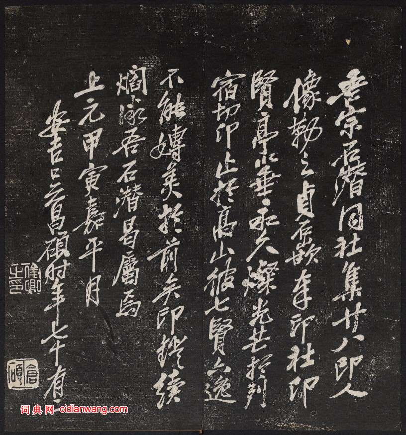 釋文:吾宗石潛同社集二十八印人像勒之貞石,嵌奉印社仰賢亭,以垂永久。燦光芒於列宿,切仰止於高山,彼七賢六逸,不能嫥美於前矣。印燈續焰,微吾石潛曷屬焉。