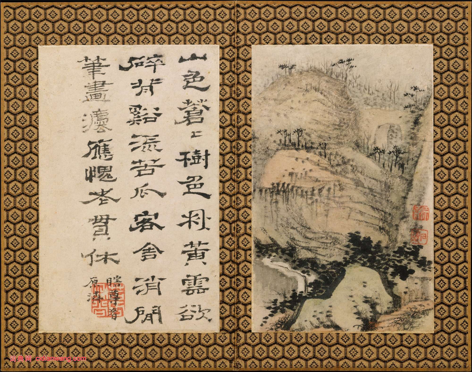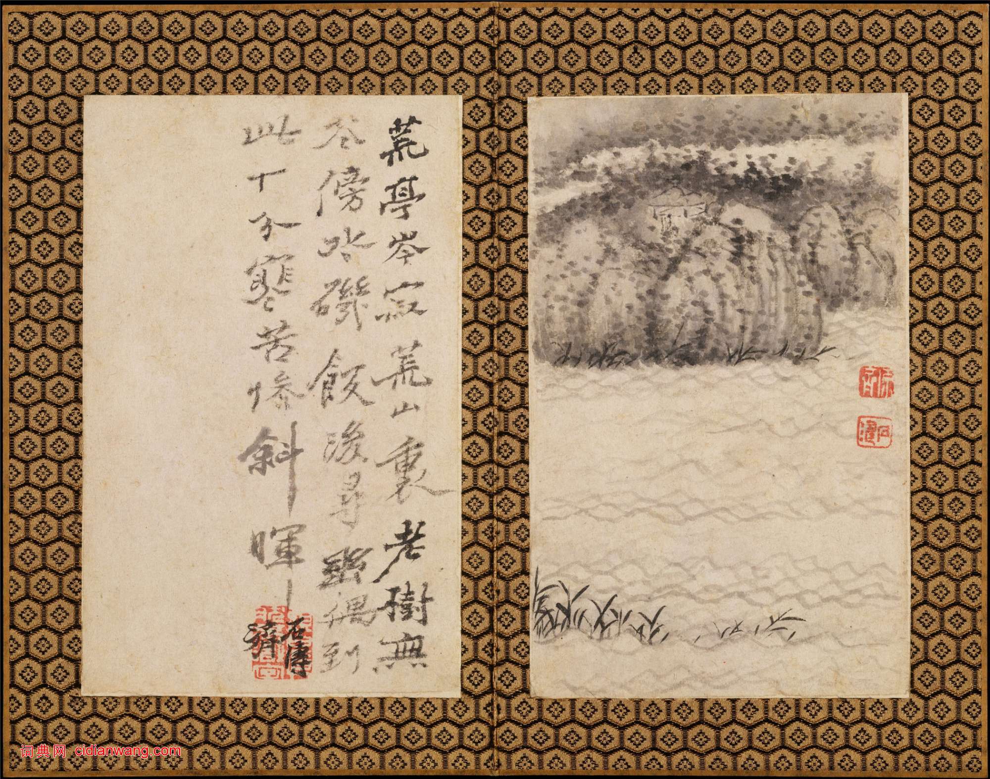 第一幀:落葉隨風下,殘煙盪水歸。小亭依碧澗,寒襯白雲肥。石濤。