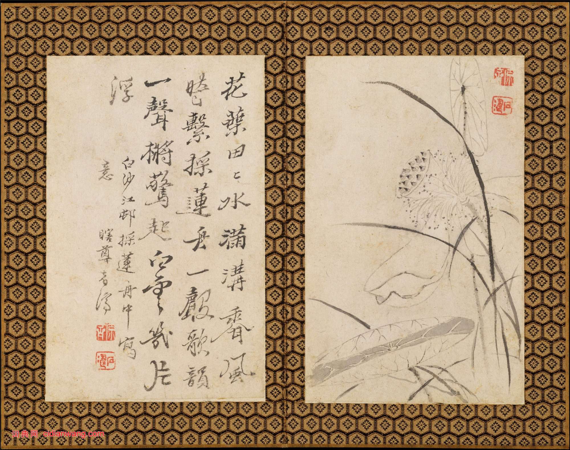 第六幀:花葉田田水滿溝,香風時擊採蓮舟,一聲歌韻一聲槳,驚起白雲兒片浮。白沙江村採蓮舟中寫意。瞎尊者,濟。