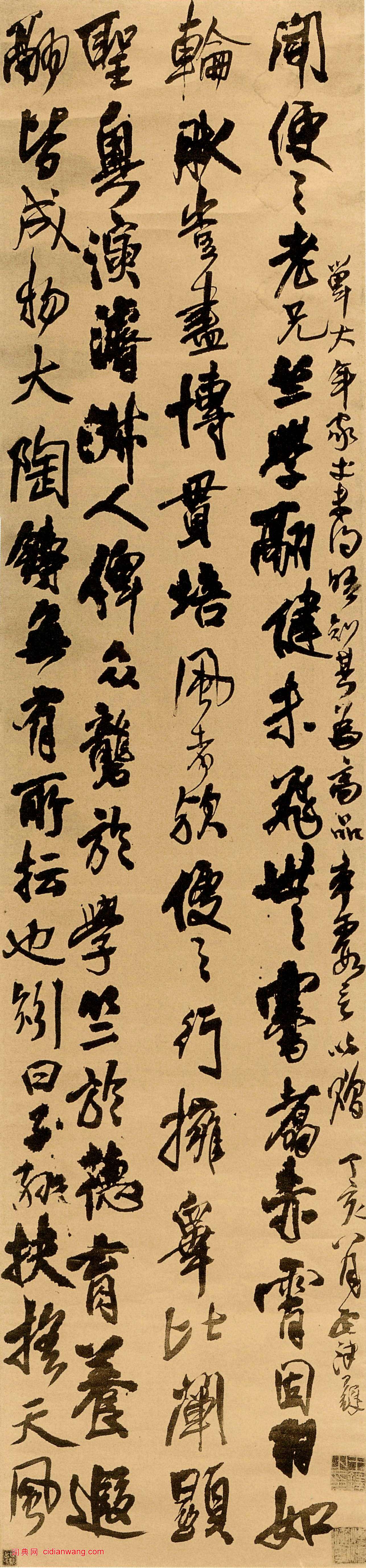 王鐸《行書贈單大年家丈立軸》 綾本 縱234cm,寬56cm,自署書於丁亥年(清順治四年,1647年)。凡五行,共101字。台灣何創時書法藝術館藏
