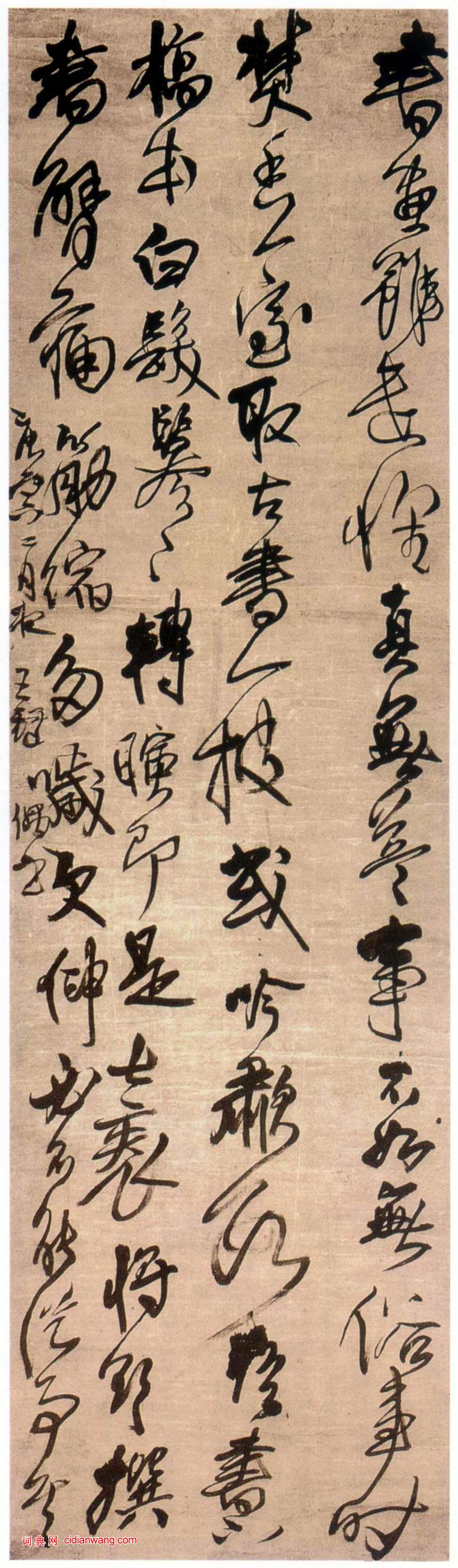 王鐸《書畫雖遣懷文語軸》自署書於庚寅年(清順治七年,1650年)五十九歲作,行書絹本,文語一則,一語道破書法的天機。 凡五行,共70字。縱203cm,橫50cm。首都博物館藏。