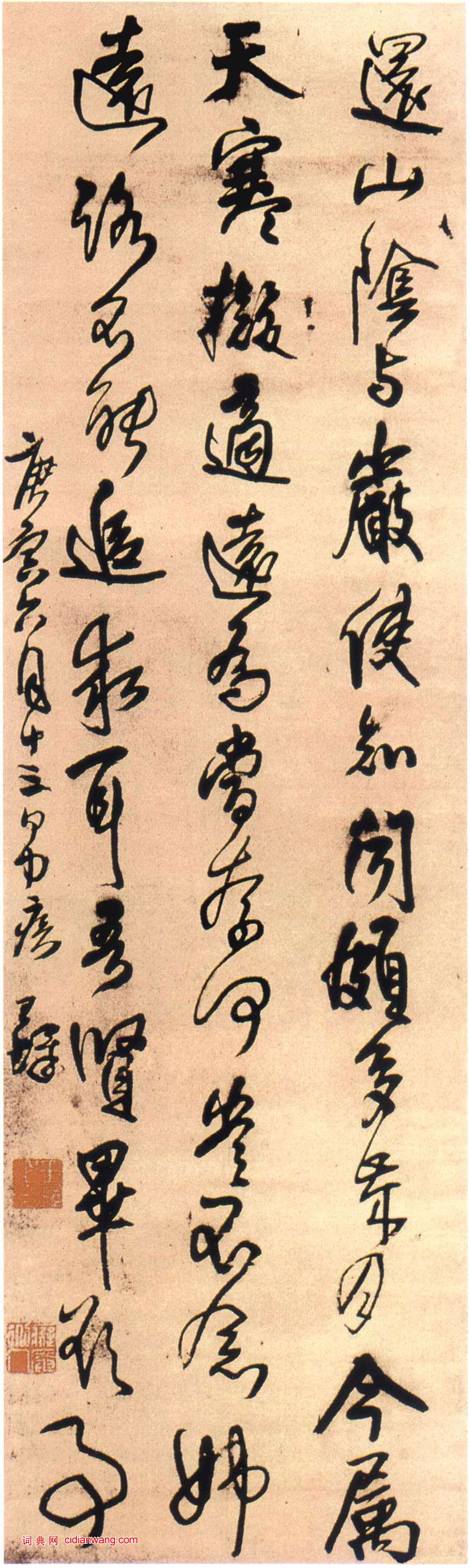 王鐸《臨王獻之敬祖帖,鄱陽帖》軸,行草,綾本,書於清順治七年(庚寅1650年),縱173cm,橫50cm。