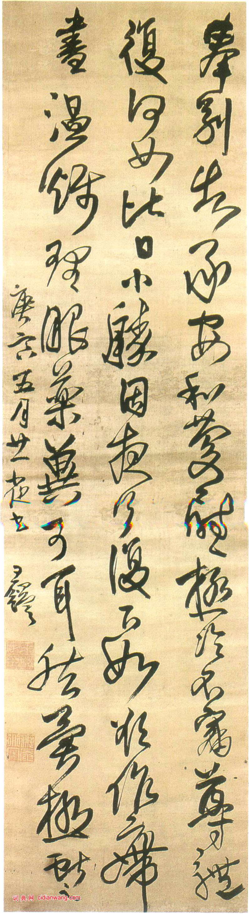 王鐸《草書臨王獻之奉別帖軸》 ,180.1X47.5cm,書於清順治七年(庚寅1650年), 遼寧省博物館。