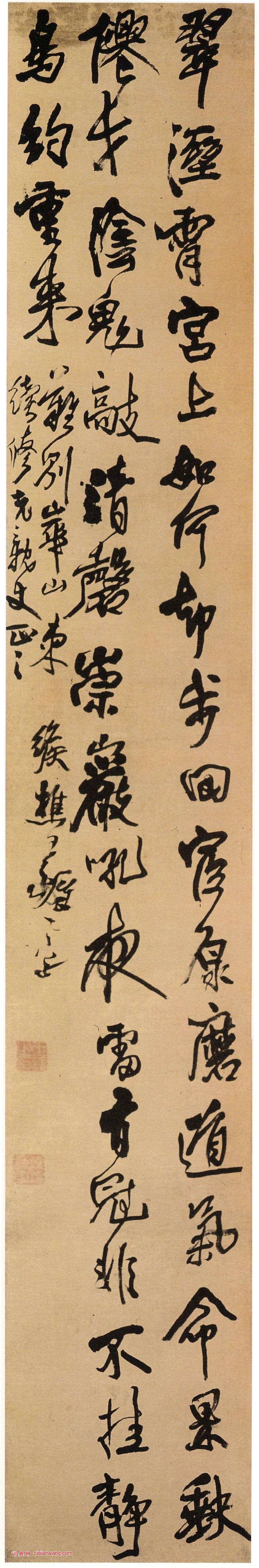 王鐸行書《五言詩軸》約書於辛卯年(清順治八年,1651年)、綾本。凡三行,共58字。縱213.5cm,橫43cm。山西省博物館藏。
