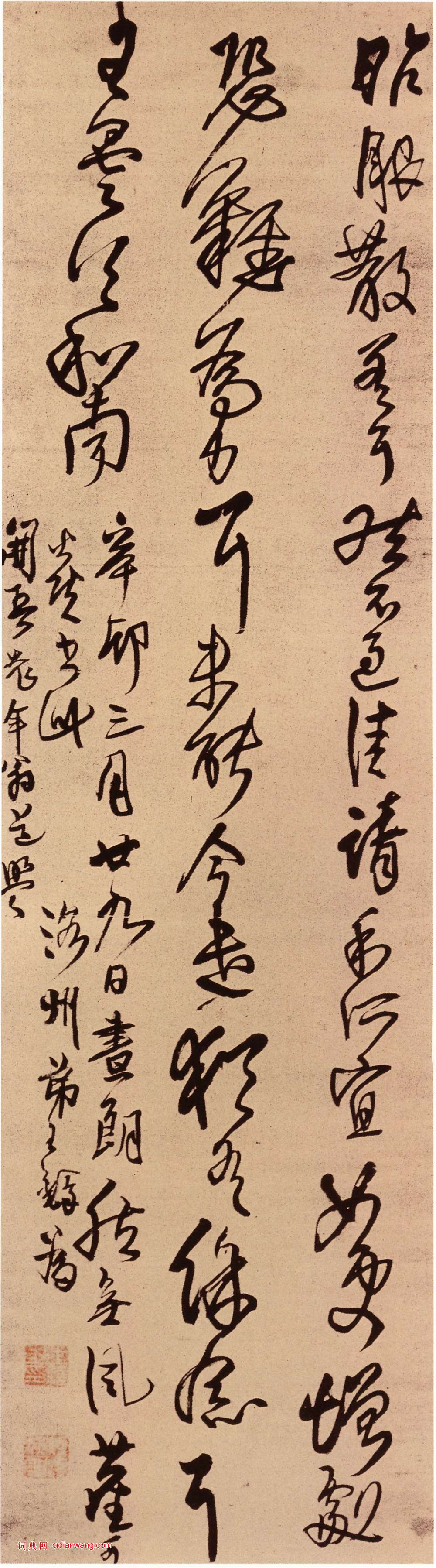 王鐸《臨王曇首昨服散帖》(五十五歲作)自署書於辛卯年(清順治八年,1651年),草書臨王曇首服散帖立軸。凡五行,共66字。縱191cm,橫52cm。藏處不詳。