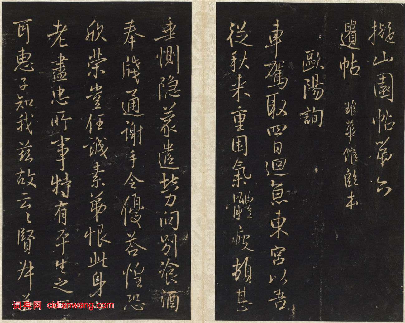 王鐸《擬山園帖》,共十卷,清代個人叢帖。清順治八年至十六年(公元1651-1659年)王鐸之子無咎撰集,古燕呂昌摹,張翱鐫,經折裝,墨紙尺寸:22.7x13.3 cm。帖名行書。此帖全刻王鐸一家之書,共103種,其中大多為臨古之書。這也是王鐸的最有名的代表作,世稱“神筆王鐸”。此本為清順治16年(1659)拓本,哈佛大學圖書館藏。