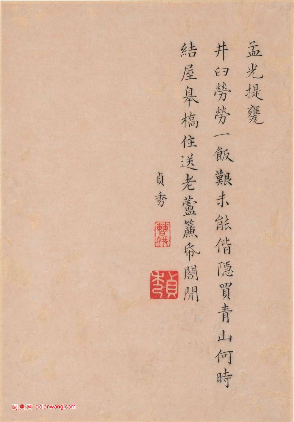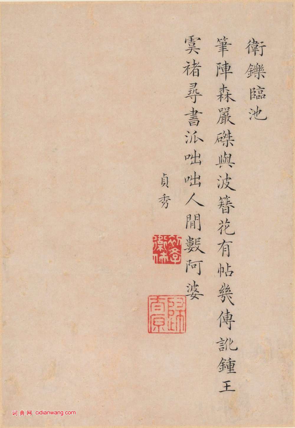 資源下載魏晉書法唐朝書法宋朝書法元朝書法明朝書法清朝書法近現代書法字典網>> 歷代書法>> 清朝>> 曹貞秀小楷《列女圖冊》(3)正文 曹貞秀小楷《列女圖冊》(3)作者:曹貞秀 書體:小楷 衛鑠臨池孟光提瓮首 頁 上一頁 1 2 3 4 5 6 7 8 9 下一頁 尾 頁 全文2018-10-29 18:10:16 相關文章:林散之跋黃賓虹《黃山臥遊》 (行書)▶釋文:黃山臥遊|前後雲海,一松一石無不入畫,撫琴動操,欲令眾山皆響。 虹叟林散...蒲華《行書自作詩四首》 (行書)蒲華《行書自作詩四首》釋文:瑤台豈不得春多,花木叢香聚綺羅。拾級登臨高百尺,無涯...安弘嵩《大智度論殘卷》 (隸楷)安弘嵩《大智度論殘卷》(局部)紙本,隸楷書 25.1×342.5厘米 北京故宮...2017年米芾集字春聯 (行書)上聯:雞鳴曉旦下聯:燕舞陽春上聯:神猴辭歲下聯:金鳳迎春上聯:雄雞唱韻下聯:大地...寫楷書方法,寫好楷書15招1、楷書當以沉靜為本,即用筆精到細膩,鋒勢備全,筆形到位,結字熨帖,有雍容自如之...文徴明行書《書沈石田畫卷》 (行書)文徴明77歲書法墨跡《書沈石田畫卷》,沈石田即沈周,紐約大都會博物館藏。釋文:王...趙孟頫行草《寄題杜尊師白雲庵瓊秀亭》二首 (行草)本段錄自作詩《寄題杜尊師白雲庵瓊秀亭》二首:白雲從何來,乃在計籌山。山中老仙伯,...葛元喆·跋米友仁《瀟湘奇觀圖》 (楷書)【釋文】米氏父子書畫擅當世,是卷沉著痛快,字如其圖,尤作全也。臨川元喆題。 ...成親王行書《杜甫秋興詩》 (行書)成親王永瑆行書《杜甫秋興詩》,此本墨跡藏錢撫棠少宰家,吳門翻刻。釋文:秋興玉樹凋...米芾《公議帖》 (行書)【釋文】芾頓首再拜。長至,伏願制置發運左司學士,主公議於清朝,振斯文於來世,彌縫...