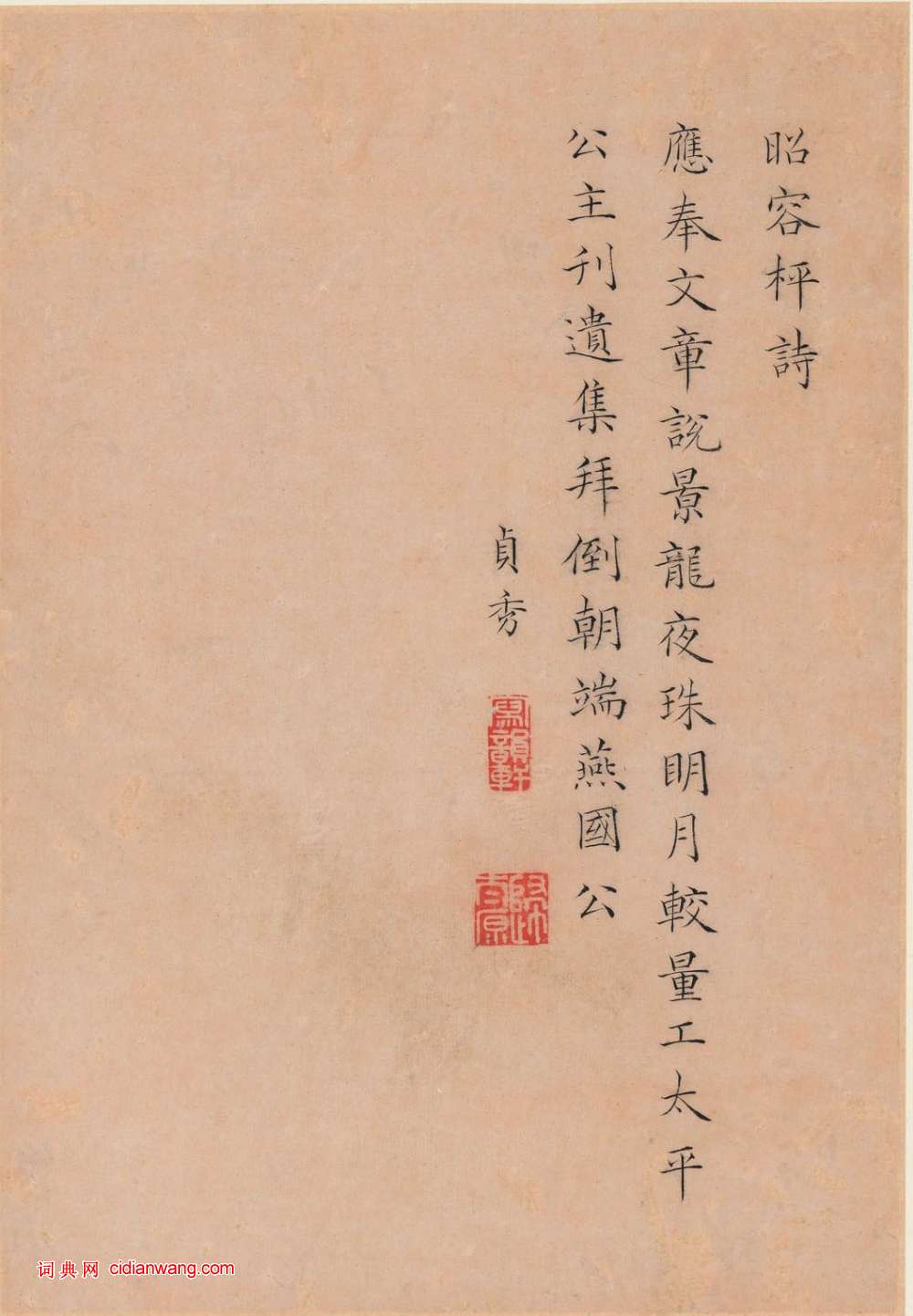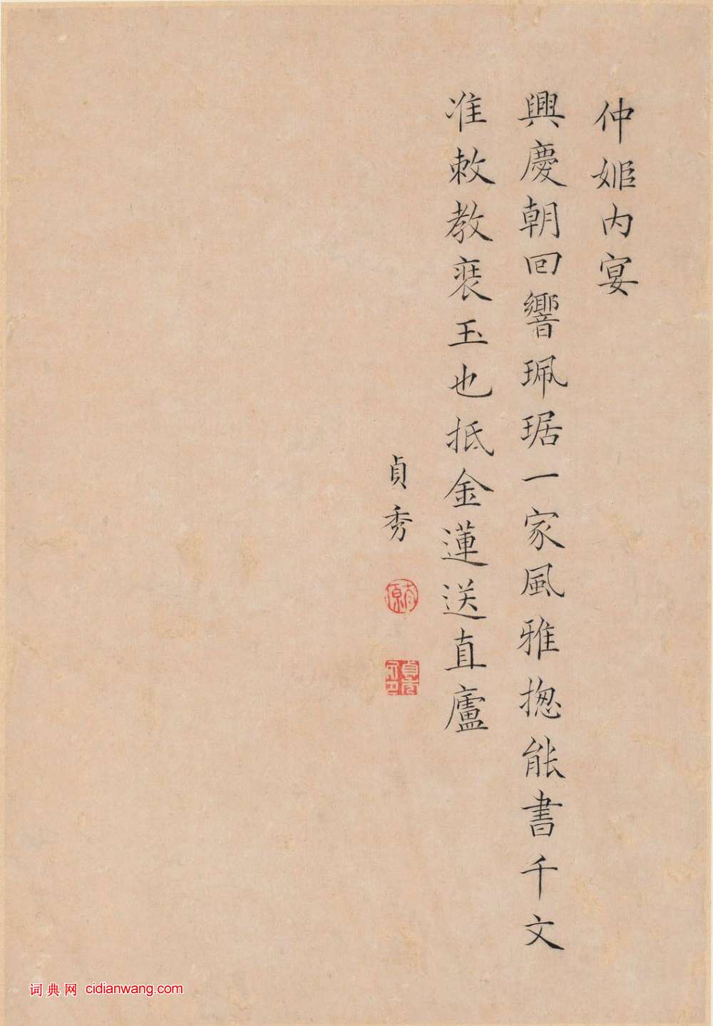 資源下載魏晉書法唐朝書法宋朝書法元朝書法明朝書法清朝書法近現代書法字典網>> 歷代書法>> 清朝>> 曹貞秀小楷《列女圖冊》(8)正文 曹貞秀小楷《列女圖冊》(8)作者:曹貞秀 書體:小楷 昭容枰詩仲姬內宴首 頁 上一頁 1 2 3 4 5 6 7 8 9 下一頁 尾 頁 全文2018-10-29 18:10:16 相關文章:蔣傑·行草登岱詩 (行草)釋文《登岱作》。千盤鳥道轉高峰,玉輦曾經過六龍。松葉未收秦日雨,雲光常護漢時封。...朱德潤·跋黃宗道《獲鹿圖》 (行書)朱德潤跋黃宗道《獲鹿圖》,美國大都會藏。王鐸行書《評米一段》軸 (行書)王鐸《評米一段》軸,行書,書於清順治八年(辛卯1651年)釋文:麃書怒震,少含蓄...任政臨歐陽詢《虞恭公碑》冊 (楷書)任政臨歐陽詢《虞恭公碑》冊署年:戊申(1968年)款識:戊申春日臨歐陽率更虞恭公...西周青銅《逨盤》 (篆書)逨盤 西周(公元前11世紀-公元前771年)圖片由heshi提供尺寸:通高20....張鳳翼·題《李思訓碑》 (行書)張鳳翼題《李思訓碑》,行書。董小宛《小楷秋閨詞自作七言詩十一首扇面》 (小楷)董小宛《小楷秋閨詞自作七言詩十一首扇面》金箋紙楷書 18.5×51.4cm 吉...柳公權小楷《太上老君常清淨經》 (小楷)柳公權《太上老君常清淨經》 楷書 《太上老君常清淨經》,書法介於柳楷與王羲之小楷...董其昌行書跋陸機《平復帖》 (行書)董其昌50歲書法題跋陸機平復帖,北京故宮博物院藏。釋文:右平原真跡,有徽宗標字及...鄭思肖《跋葉鼎隸書金剛經冊》 (行草)鄭思肖宋末元初詩人、畫家,連江(今屬福建)人。原名不詳,宋亡後改名思肖,因肖是宋...