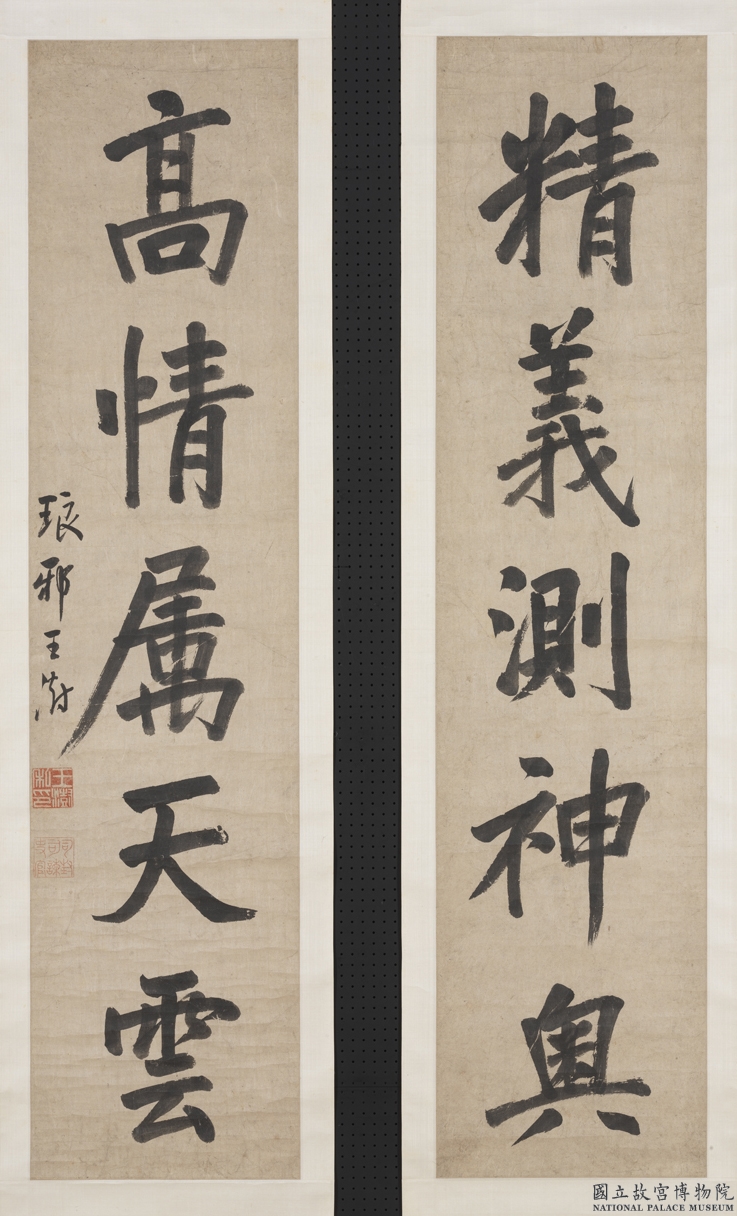王澍《楷書精義高情五言聯》,紙本,楷書,尺寸:105.6×25cm×2,台北故宮博物院藏。