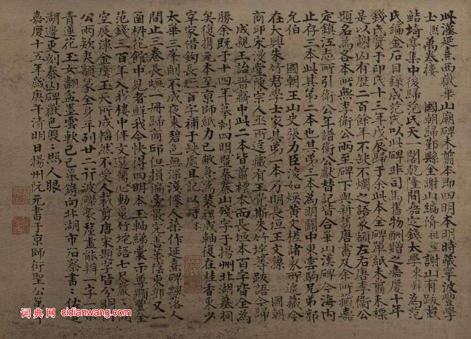此漢延熹西嶽華山廟碑未翦本即四明本,明時藏寧波豐學士(熙)萬卷樓。國朝歸鄞縣全謝山編修(祖望),謝山有跋載鮚崎亭集中後歸范氏天一閣。乾隆間嘉定錢太學(東壁)為范氏編金石目錄成,范氏以此碑非司馬舊物酬贈之,嘉慶十年錢氏質於印氏十三年戊辰歸於余。此本全碑單紙未翦未裱,是以謝山有歷程二百餘年不缺不爛之語,篆額左右唐李衛公題名為各本所無,李衛公兩至碑下與新舊唐書及余所藏嘉定鎮江志所引衛公年譜,衛公獻替記皆合,華山漢碑今海內止存三本,此其第二本也,其第三本為明關中東雲駒兄弟郭允伯。國朝王山史、張力臣、凌如煥、黃文槎諸家所遞藏,今在大興朱竹君學士家,其第一本乃明長垣王文孫、國朝商邱宋漫堂陳宗人丞所遞藏,有王覺斯、朱竹坨等跋語,今歸成親王詒晉齋中,此二本皆翦裱本而長垣本百字皆全為勝,余既於十四年摹刻,四明暨秦泰山殘字於揚州北湖墓祠矣。復攜元本至京師,紙力已敝,急為裝裱成軸,復在桂香東少宰家借鉤長垣百字補於缺處,且記以詩(本):“太華三峰削不成,夜來碧色無深淺。仙人染作延熹碑,飄落人間止三卷。長垣一冊歸商邱,但損偏旁最完善。華陰東郭又一函,椒花館中貝者鮮。我今快得四明本,玉軸綈囊示尊顯,豐全范錢三百年。入我樓中伴文選,驚心動魄竹坨語,七尺嚴嚴辟空展,渾金璞玉天所成,幡然不受人裁剪,唐宋題字皆分明,衛公兩款夾額篆,全身平列廿二行,波磔豪厘盡能辨,一字一朵青蓮花,玉女翻盆墨雲軟。已已摹鐫向北湖,市石察書書佐遣,遣邊更刻泰山碑,岳色雙雙照人眼。”