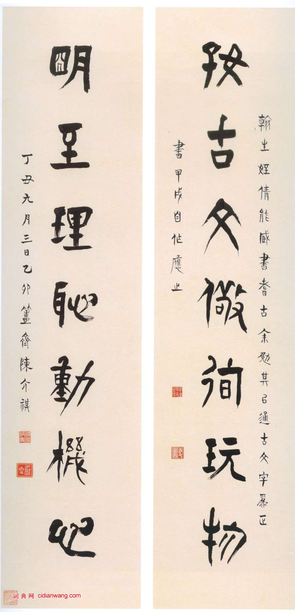陳介祺 《篆書好古明至七言聯》,紙本篆書 ,書於清朝光緒帝德宗光緒三年(1877年),123×30cm×2 ,青島市博物館藏。