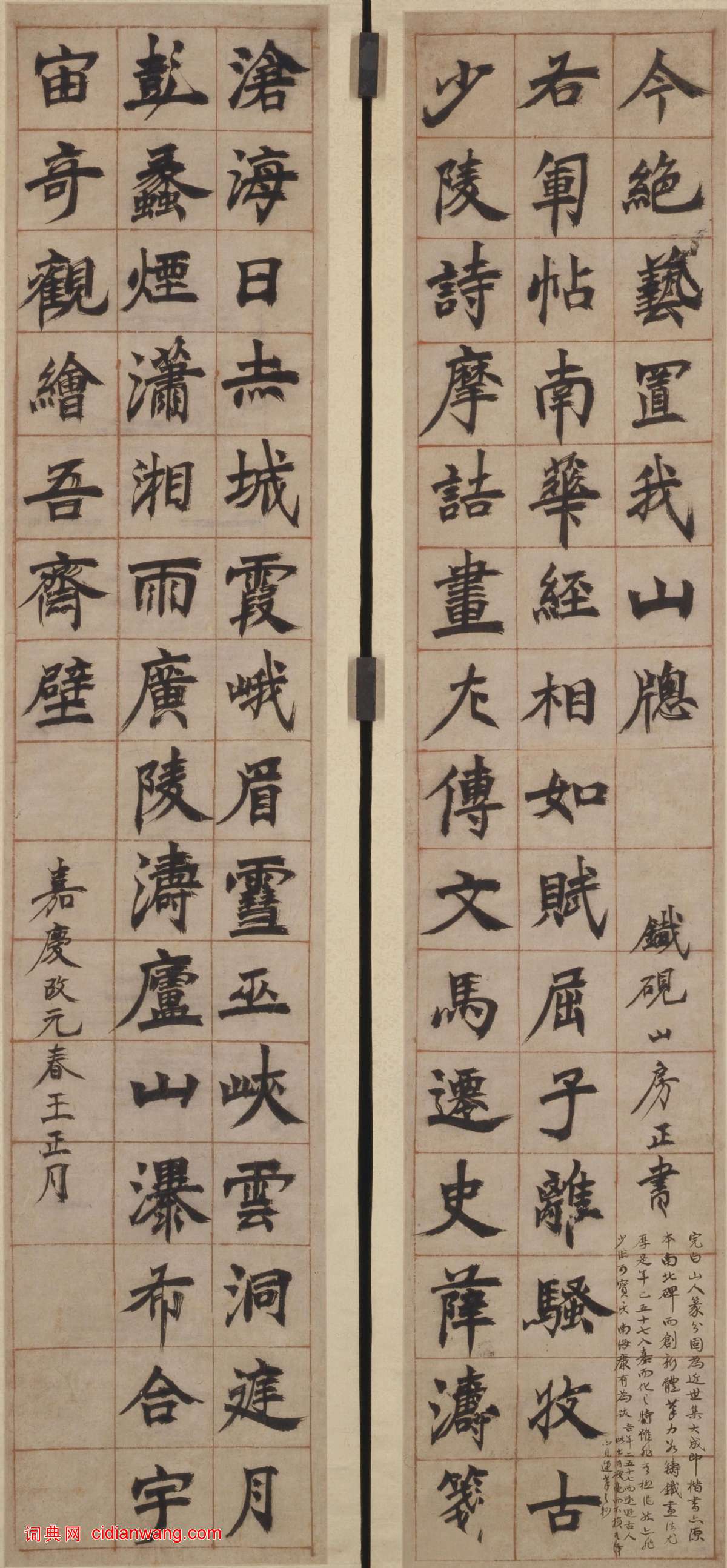 此聯為龍門式對聯,書於“嘉慶改元春王正月”,末款識“鐵硯山房正書”。嘉慶元年(1796年),鄧石如時年54歲。下聯本幅右下有清康有為跋一段。無鑑藏印記。康有為在題跋中稱:“完白山人篆分固為近世集大成,即楷書亦原本南北碑而創新體,筆力如鑄鐵,畫法尤厚。”此聯書法古茂沉雄,體兼隸楷,法於魏碑,存隸書孑遺,有隸楷之謂。運筆渾厚,風格蒼古質樸,體現出深厚的碑學基礎。(撰稿人:馬季戈)