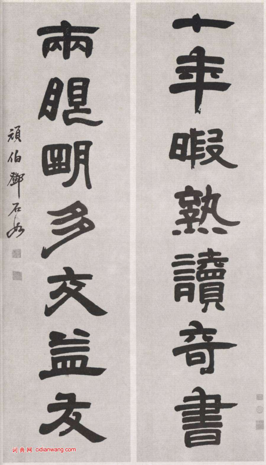 書法欣賞魏晉書法唐朝書法宋朝書法元朝書法明朝書法清朝書法近現代書法字典網>> 歷代書法>> 清朝>> 鄧石如《十年兩眼隸書七言聯》正文 鄧石如《十年兩眼隸書七言聯》作者:鄧石如 書體:隸書 鄧石如《十年兩眼隸書七言聯》釋文:十年暇熟讀奇書,兩眼明多交益友。頑伯鄧石如2019-3-7 10:04:38 鄧石如的相關書法作品:鄧石如隸書《世慮全消四幅屏》 鄧石如《隸書古銘軸》 鄧石如篆書《弟子職》 鄧石如楷書《答謝中書書》 鄧石如《四體書冊》之《怪石長松篆書冊》 鄧石如《篆書軸》 鄧石如隸書《易經謙卦》 鄧石如《贈華南學長篆書七言聯》 鄧石如篆書《小窗幽記》節選 相關文章:北齊《泰山佛說金剛經》 (隸書)《泰山經石峪》,又名《泰山佛說金剛經》,摩崖石刻,北齊天保間刻,刻于山東泰山斗母...張弼草書《御溝流紅詞軸》 (草書)張弼《御溝流紅詞軸》紙本草書 148×69cm 陝西歷史博物館藏 釋文:選入...張雨跋《趙孟頫行書三段卷》 (行書)張雨跋《趙孟頫行書三段卷》,元,紙本,行書,北京故宮博物院藏。釋文:唐吳貞節薦李...王鐸·跋米芾《行書三札卷》 (行書)王鐸跋米芾《行書三札卷》,故宮博物院藏,為王鐸關於觀賞此卷與友人的通信一封。康有為《行書側身獨立七言聯》 (行書)康有為《行書側身獨立七言聯》紙本行書 150×39cm×2 浙江省博物館藏 ...陸深《瑞麥賦卷》下卷 (行書)陸深《瑞麥賦卷》(下卷)紙本行書 32.9×1056cm 北京故宮博物院藏 《...長沙窯詩文壺《仁義禮智信》題記壺 (楷書)楷書——青釉褐彩“仁義禮智信”題記壺 高15厘米 底徑9.8厘米 湖南省博物館藏...吳熙載《草書花底燈前七言聯》 (草書)吳熙載《草書花底燈前七言聯》 136×28cm×2 西泠印社藏釋文:花底振衣...傅山小楷《五言詩》扇面 (小楷)傅山《楷書五言詩》扇 紙本 16.8×53cm 廣州藝術博物院藏 ...尤袤·跋李結《西塞漁舍圖》 (行書)尤袤跋李結《西塞漁舍圖》,縱40.7厘米。大都會美術館藏。