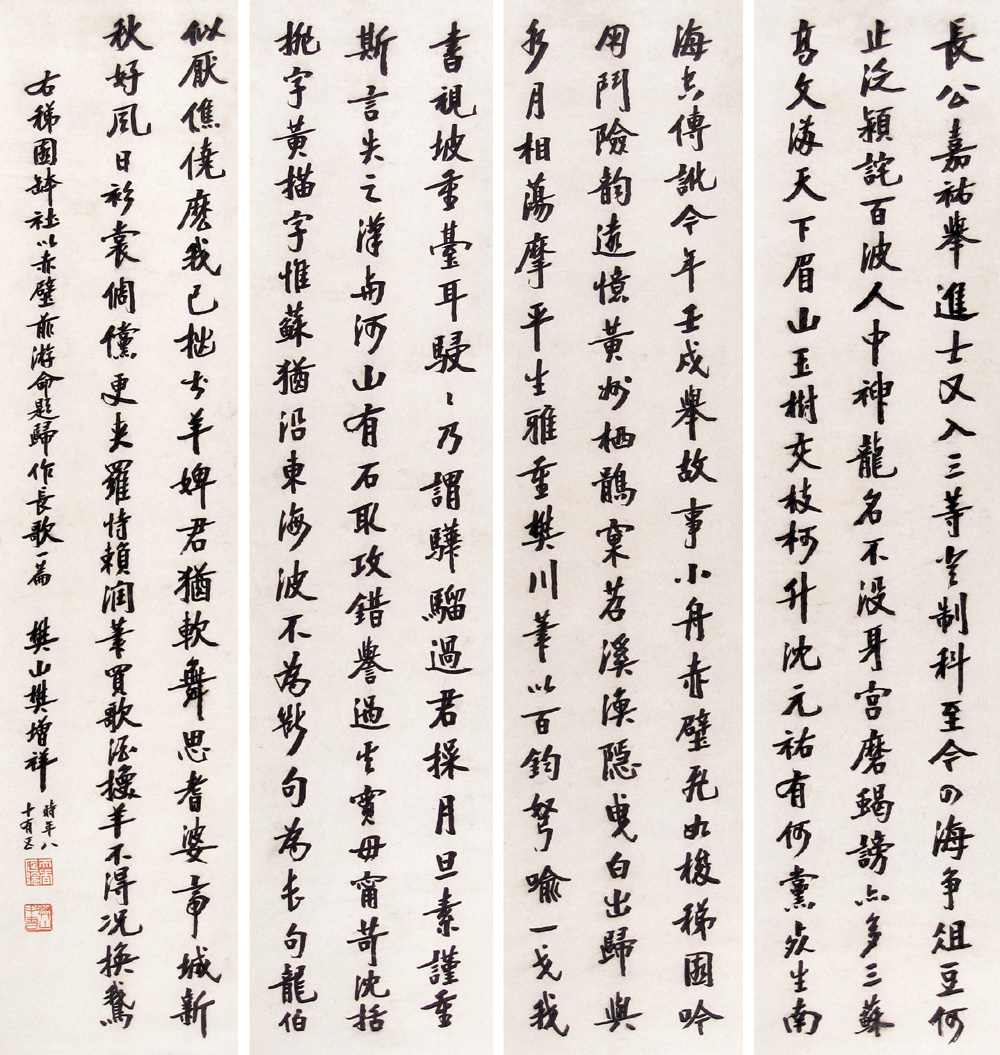 書法欣賞魏晉書法唐朝書法宋朝書法元朝書法明朝書法清朝書法近現代書法字典網>> 歷代書法>> 清朝>> 樊增祥行書《四條屏》正文 樊增祥行書《四條屏》作者:樊增祥 書體:行書 樊增祥行書《四條屏》,130×30cm×4,圖片來自藍天國際拍賣行有限責任公司2005秋季藝術品拍賣會。落款:樊山樊增祥時年八十有五鈐印:天香庭院、樊山手書2019-3-15 12:22:29 樊增祥的相關書法作品:樊增祥行書《四條屏》 樊增祥行書《自作七絕四首詩札》 樊增祥《行書澠池道中立軸》 樊增祥行書《七言詩立軸》 樊增祥《行書七言聯》 相關文章:蘇軾行書《廷平郭君帖》 (行書)蘇軾《廷平郭君帖》 書於1071年(熙寧四年) 行書釋文:軾啟 辱教 具審孝履支...于右任《草書杜甫前出塞之五詩軸 》 (草書)于右任《草書杜甫前出塞之五詩軸 》紙本草書 86×45cm 南京市博物館藏釋文...于右任《行書稟生賦正五言聯》 (行書)于右任《行書稟生賦正五言聯》釋文:稟生民之秀,賦正氣而興。 款署:幼農先生前...王升《衰老帖》 (行草)【釋文】升再拜 衰老杜門多病 久不承興居之問 日益系詠 近魏端叔見臨 能道動止之...蒲華《溪山春意圖並行書畫禪室隨筆扇》 (行書)蒲華《溪山春意圖並行書畫禪室隨筆扇》金箋行書 17.8×44cm 台北故宮博物...張淵行書《五言古詩帖》 (行書)《五古詩帖》頁,元,張淵書,紙本,縱27.4cm, 橫52.7cm,行書。(雲臥...脫脫木兒·跋張先《十詠圖》 (行書)【釋文】吳興老子會南園,十詠於今只獨傳。瀟灑丹青如一日,風流文彩未千年。情留去燕...趙孟頫行草《王羲之軼事卷》 (行草)元代趙孟頫行草書法欣賞《王羲之軼事卷》,美國大都會博物館藏。王羲之軼事卷釋文:羲...倪元璐《草書五言詩扇面》 (草書)倪元璐《草書五言詩扇面》 金箋 17.3×53cm 嘉德2005秋拍以下資料來...孫過庭書譜集字草書《千字文》 (草書)《千字文》根據史書記載,是南朝梁武帝在位時期(502 —549 年)編成的,其編...
