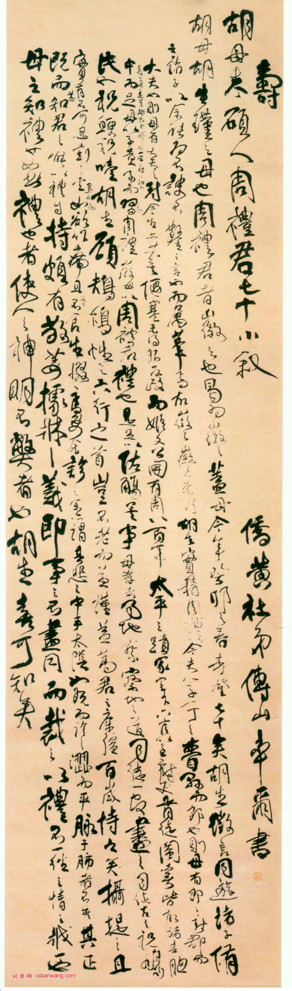 書法欣賞魏晉書法唐朝書法宋朝書法元朝書法明朝書法清朝書法近現代書法字典網>> 歷代書法>> 清朝>> 傅山行草《壽胡母朱碩人周禮君七十小敘軸》正文 傅山行草《壽胡母朱碩人周禮君七十小敘軸》作者:傅山 書體:行草 傅山行草《壽胡母朱碩人周禮君七十小敘》軸, 北京市文物商店藏 。資料來自《中國書法》雜誌2004年第9期2019-3-17 12:42:44 傅山的相關書法作品:傅山行書杜甫《和賈舍人早朝詩、賈舍人早朝大明宮詩》 傅山《丹楓閣記》 傅山《行草臨帖書冊》 傅山草書《杜甫對雨書懷走邀許十一簿公詩》 傅山《草書臨柳公權聖慈帖》 傅山《草書五言詩》 傅山行草《寄龔鼎孳七言詩翰》 傅山《草書祝錫予六十壽十二條屏》軸 傅山《草書五言詩》 相關文章:張璧《行書雜詩卷》 (行書)張璧《行書雜詩卷》,紙本張璧字崇象,明石首(今屬湖北)人。正德六年(1511年)...趙孟頫行書《寄題杜尊師白雲庵瓊秀亭》 (行書)趙孟頫行書自作詩《寄題杜尊師白雲庵瓊秀亭》,出自趙孟頫《行書三段》卷第三段,元,...張瑞圖《行草書岳陽樓記並詩》冊 (行草)張瑞圖《行草書岳陽樓記並詩》冊 紙本 29×32厘米×20 天啟五年(16...倪元璐《節錄左思“蜀都賦”草書軸》 (草書)倪元璐《節錄左思“蜀都賦”草書軸》綾本草書,156.5×49.5cm。日本兵庫...東漢篆書《袁敞碑》 (篆書)《袁敞碑》遼寧博物館藏石 全稱《漢司空袁敞碑》,東漢篆書碑刻。1923年春出土於...黃道周草書《贈屈靜根七言律詩軸》 (草書)黃道周《贈屈靜根七言律詩軸》絹本草書 236.0×53.0cm 崇禎十五年(1...錢杜《行書八言聯》 (行書)錢杜《行書八言聯》紙本行書 128.9×20.3cm×2 上海博物館藏釋 文...趙孟頫行書《山上帖》 (行書)趙孟頫書札欣賞《山上帖》(自山上來帖)紙本,縱30.5cm,橫62.7cm。北京...曾熙楷書《漢正衡石五言聯》 (楷書)曾熙《楷書漢正衡石五言聯》紙本楷書 169.2×36.8cm×2 1921年...米芾草書《論草書帖》 (草書)米芾 《論草書帖》 紙本 草書 縱24.7厘米 橫37厘米 台北故宮博物院藏 米...