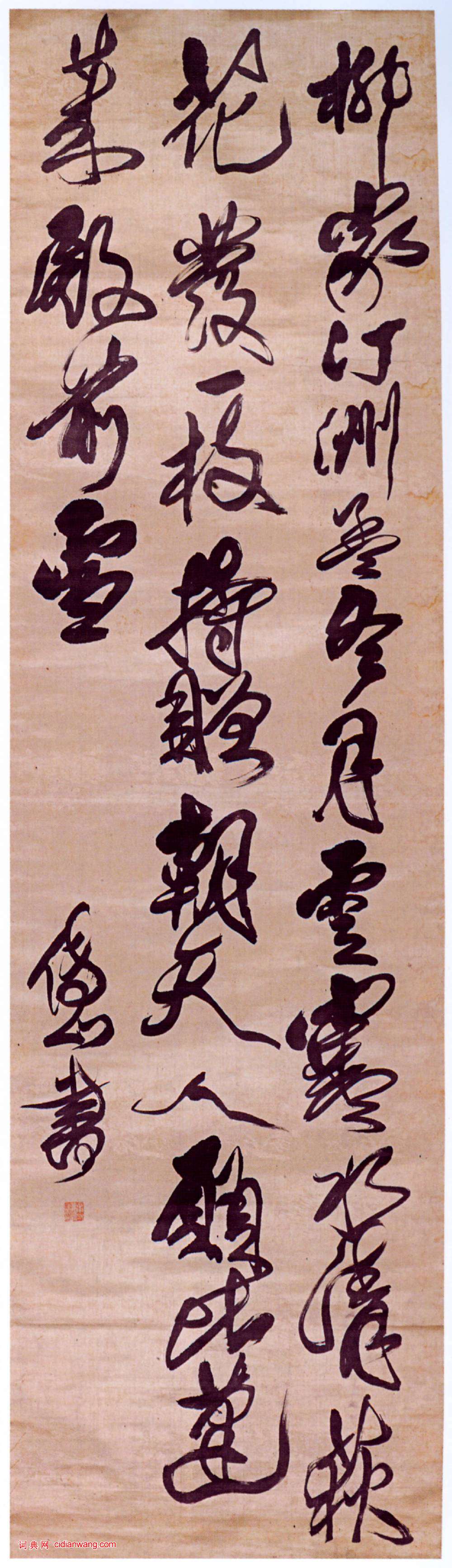 傅山《草書朱文長吳興送梁補闕歸朝賦得荻花詩》軸 ,綾本 ,181.5×50cm, 山西省博物院藏。