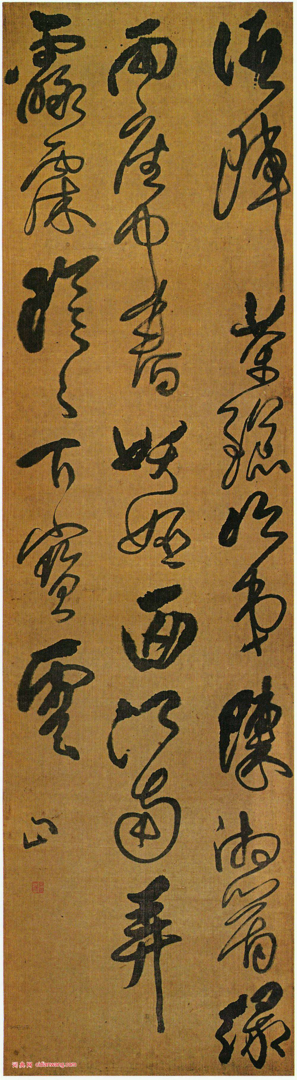 傅山草書《酒陣茶槍此第陳》詩軸, 綾本, 172cm×47cm, 山西省博物院藏。