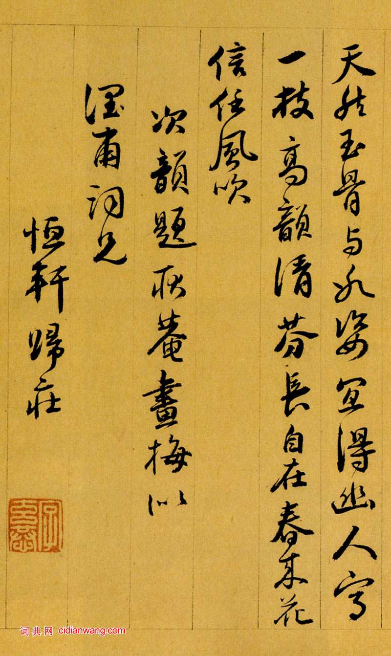 資源下載魏晉書法唐朝書法宋朝書法元朝書法明朝書法清朝書法近現代書法字典網>> 歷代書法>> 清朝>> 歸莊行楷《七絕題畫小品》正文 歸莊行楷《七絕題畫小品》作者:歸莊 書體:行書 歸莊行書《七絕題畫小品》, 紙本,尺寸: 19.5 X 26.5CM,選自台灣何創時明末清初書法展。釋文:天然玉骨與風姿,宜得幽人 一枝,高韻清芬長自在,春來花信任風吹。2019-5-15 15:42:30 歸莊的相關書法作品:歸莊行楷《七絕題畫小品》 歸莊《草書七絕詩軸》 歸莊《草書桃花黃鳥七言詩軸》 相關文章:柯九思行書《陸繼善摹禊帖》 (行書)柯九思《陸繼善摹禊帖》,紙本,行書 ,尺寸:24.7×10.7cm,台北故宮博...陸居仁《跋鮮于樞詩讚手卷》 (草書)陸居仁《跋鮮于樞詩讚手卷》 紙本,手卷,草書,縱42.7厘米,橫205.8厘米。...傅山行書《陸機六言詩軸》 (行書)傅山行書《陸機六言詩軸》, 絹本, 177×42厘米, 朵雲軒藏。【釋文】:葡...西漢隸書《上林共府銅升銘》 (隸書)中國西漢時容量為 1升的銅量器。全長16厘米,高4.5 厘米,口徑9.2厘米,容...文同·跋范仲淹《道服贊》 (行書)文同跋范仲淹《道服贊》,行書,縱34.8cm,北京故宮博物院藏。文同的書法墨跡不...張瑞圖草書《李白月下獨酌》 (草書)張瑞圖 草書《李白月下獨酌》 紙本 北京故宮博物院藏【釋文】花間一壺酒,獨酌無相...康有為行書《護世游天五言聯軸》 (行書)康有為《護世游天五言聯軸》 紙本行書 130cm×32cm×2 丙寅(1...吾衍篆書《題張好好詩卷》 (篆書)吾衍篆書題《張好好詩卷》 ...王穉登·題周天球《桃花書屋書法卷》 (行書)明-王穉登題周天球《桃花書屋書法卷》,行書。蘇軾《寒食帖》,蘇軾黃州寒食帖 (行書)《寒食帖》又名《黃州寒食詩帖》或《黃州寒食帖》。是蘇軾撰詩並書,墨跡素箋本,橫3...
