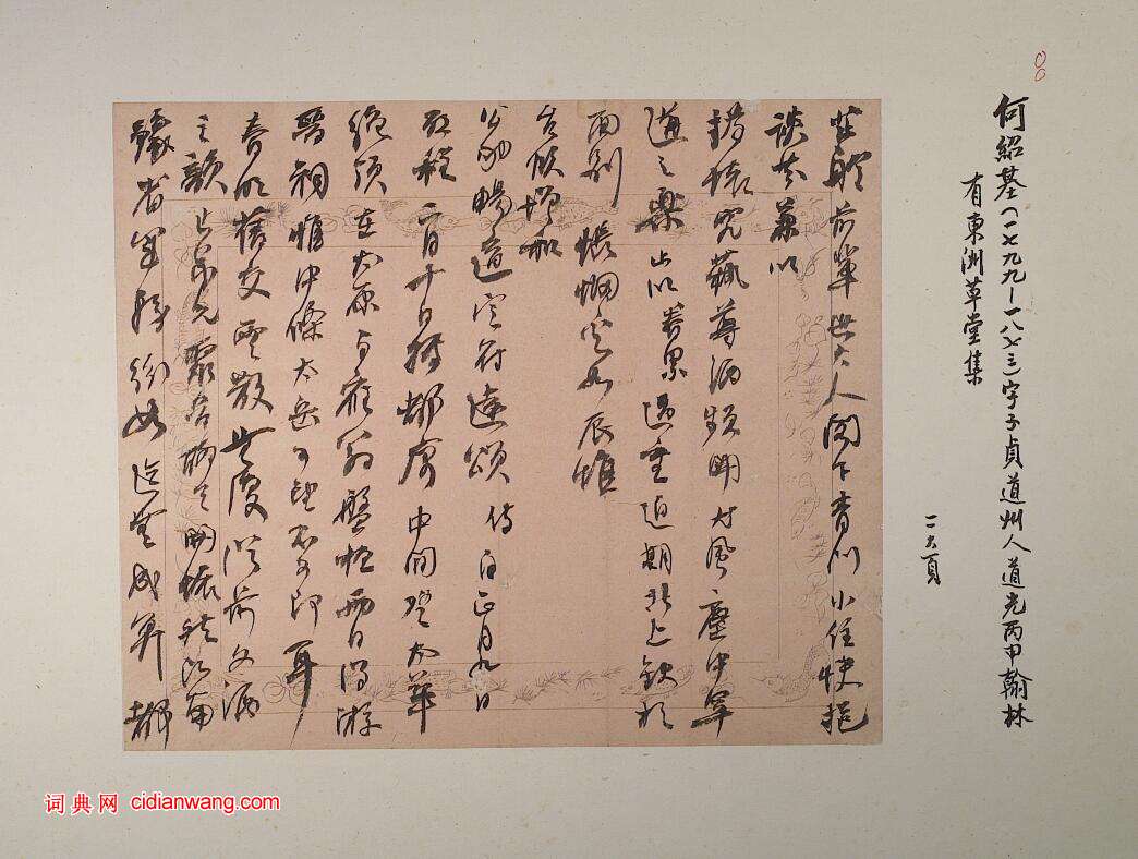 何紹基精通金石書畫,以書法著稱於世。譽為清代第一。初習顏,中年博習南北朝書,筆法剛健,此期作品傳世甚少。後致力分隸,漢魏名刻,無不深研熟密閉,臨摹多至百本。偶為小篆,不顧及俗敷形,必以頓挫出之,寧拙毋巧。暮年眼疾,作書以意為之,筆輕墨燥,不若中年之沉著俊爽,每有筆未至而意到之妙。年尊望重,求書反多,故史年作品傳世較多。尤以篆隸法寫蘭蕙竹石,寥寥數筆,金石書卷之氣盎然。何氏博學多才,尤工於詩。有《東洲草堂集》。何氏晚年寓滬,卒於吳縣,歸葬長沙南郊石人沖。