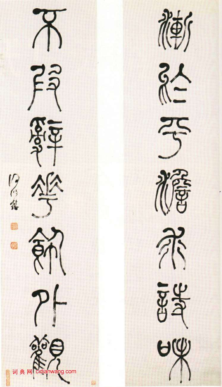 資源下載魏晉書法唐朝書法宋朝書法元朝書法明朝書法清朝書法近現代書法字典網>> 歷代書法>> 清朝>> 何紹基篆書《漸於不假七言聯》正文 何紹基篆書《漸於不假七言聯》作者:何紹基 書體:篆書 何紹基《篆書漸於不假七言聯》,尺寸139×32.7cm×2 ,揚州市博物館藏。釋文:漸於平澹求詩味,不假辭華飾外觀。2019-8-17 16:37:12 何紹基的相關書法作品:何紹基行書《七絕軸》 何紹基行書《蘇軾和子由論書》 何紹基行書《詠落花七律十五章》 何紹基行書《世事古人七言聯》 何紹基行書《雨後秋深七言聯》 何紹基行書《澹香書屋橫披》 何紹基《行書小海層樓七言聯》 何紹基楷書《鵬鶚龍鸞五言聯》 何紹基《行書山雲湖水七言聯》 相關文章:鄧石如《十年兩眼隸書七言聯》 (隸書)鄧石如《十年兩眼隸書七言聯》釋文:十年暇熟讀奇書,兩眼明多交益友。頑伯鄧石如呂顓·跋趙令穰《湖莊清夏圖卷》 (行書)呂顓跋趙令穰《湖莊清夏圖卷》,行書,縱19.1cm。波士頓美術館藏。歸昌世行草書扇面 (行草)歸昌世行草書扇面唐寅行書《千金良夜七言律詩軸》 (行書)唐寅《“千金良夜”七言律詩軸》紙本行書 140×25.2cm 台北故宮博物院藏...劉鈺行書《仰間帖》 (行書)劉鈺《仰間帖》紙本 行書 27.9×42厘米 北京故宮博物院藏 釋文:仰間勿辱...吳勉行草《跋何澄歸莊圖卷》 (行草)其生平無考。從其《跋何澄歸莊圖卷 》書風及題識位置推測,當為元末明初時人,款後鈐...彭年《楷書詩扇面》 (小楷)彭年《楷書詩扇面》金箋 17×52cm 中國嘉德 嘉德四季第1期拍賣會 ...笪重光行書《擬白居易詩軸》 (行書)笪重光《擬白居易詩軸》,紙本,行書,94.5×42.7cm,北京故宮博物院藏。...東晉《王仚之墓誌》 (隸書)東晉《王仚之墓誌》東晉《王仚之墓誌》,志為東晉太和三年(公元368年)刻。200...文彭隸書跋《祝允明東坡記游卷》 (隸書)文彭跋《祝允明小楷東坡記游卷》,隸書,紙本,全卷縱17.6厘米,現藏遼寧省博物館...