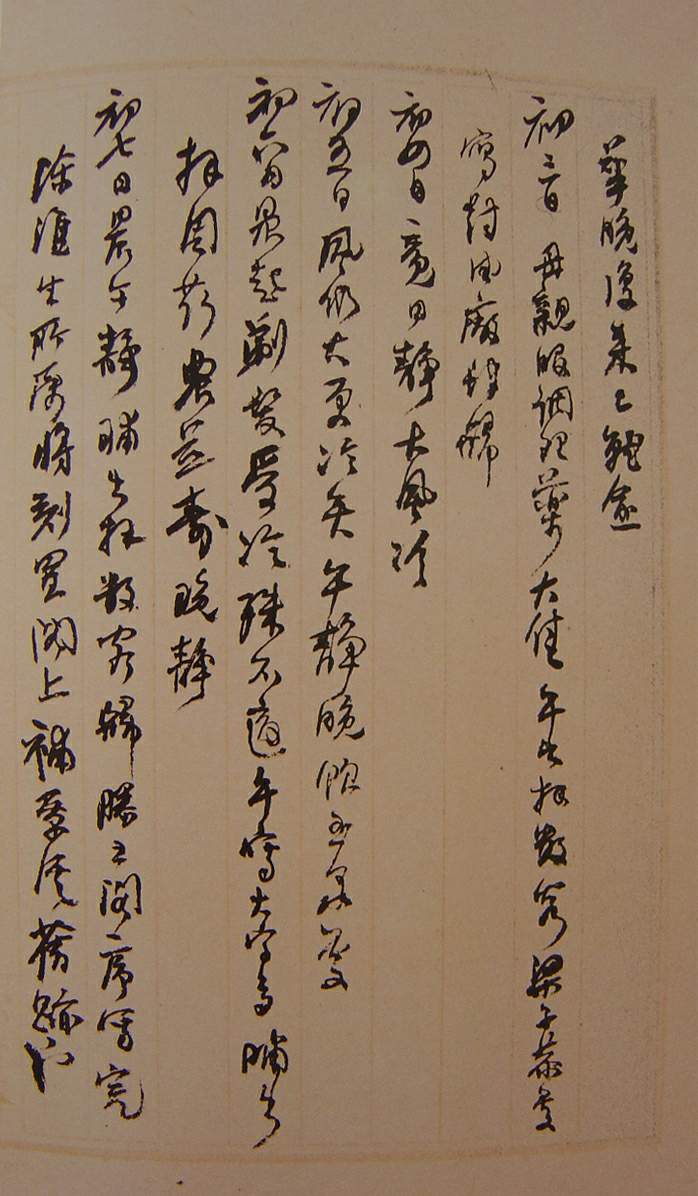 資源下載魏晉書法唐朝書法宋朝書法元朝書法明朝書法清朝書法近現代書法字典網>> 歷代書法>> 清朝>> 何紹基草書《種竹日記》(18)正文 何紹基草書《種竹日記》(18)作者:何紹基 書體:草書 首 頁 上一頁 14 15 16 17 18 19 20 21 22 23 下一頁 尾 頁 全文2019-9-26 17:17:16 何紹基的相關書法作品:何紹基《行書山雲湖水七言聯》 何紹基行書《紅顆綠苞聯》 何紹基楷書《愛蓮堂題匾》 何紹基行書《題梅花詩軸》 何紹基《臨道因碑》 何紹基篆書《節錄庾信三月三日華林園馬射賦序四條屏》 何紹基行書《喜聞過齋題匾》 何紹基隸書立軸 何紹基隸書《嘉言游好五言聯》 相關文章:順治行書《論桐文》 (行書)順治帝福臨,是清朝入關後的第一位皇帝。他是皇太極的第九子,生於崇德三年(1638...董其昌草書《房村夜宿詩扇面 》 (草書)董其昌草書房村夜宿詩扇面 釋文:桺外青簾颺晚風,宣房遺蹟草連空,誰知半卷河渠記,...柯九思·題趙孟頫《疏林秀石圖》 (行書)柯九思 題趙孟頫《疏林秀石圖》,台北故宮博物院藏。釋文:碧浪湖頭雲色,苕溪晚山煙...懷素·論書帖 (草書)【釋文】為其山不高,地亦無靈;為其泉不深,水亦不清;為其書不精,亦無令(今)名,...宣昭行書《致九成隱君先生尺牘》 (行書)宣昭《致九成隱君先生尺牘》 紙本行書 29×44.5cm 台北故宮博物院藏釋文...文徵明小楷《太上老君說常清淨經》 (小楷)文徵明小楷《太上老君說常清淨經》、《老子列傳》合冊,紙本,縱20.9厘米,橫11...梁同書《行書董其昌語軸》 (行書)梁同書《行書董其昌語軸》紙本行書 132.4×61.5cm 上海博物館藏釋文:...鄺露《草書杜甫詩軸》 (草書)鄺露《草書杜甫詩軸》 紙本 93×36cm 台北何創時書法藝術基金會藏 釋文:...范成大草書《雪後帖》 (草書)范成大《雪後帖》紙本 31.9×51.3cm 台北故宮博物院藏 范成大《雪後帖...唐寅行書《尺牘之二》 (行書)唐寅《尺牘之二》紙本行書 26.1×19.1cm 台北故宮博物院藏 釋文:別後...