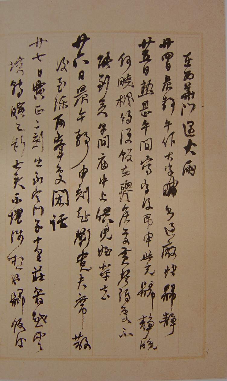 資源下載魏晉書法唐朝書法宋朝書法元朝書法明朝書法清朝書法近現代書法字典網>> 歷代書法>> 清朝>> 何紹基草書《種竹日記》(7)正文 何紹基草書《種竹日記》(7)作者:何紹基 書體:草書 首 頁 上一頁 3 4 5 6 7 8 9 10 11 12 下一頁 尾 頁 全文2019-9-26 17:17:16 何紹基的相關書法作品:何紹基《楷書格言卷》 何紹基隸書《以俟知奧橫幅》 何紹基《行書手札》 何紹基隸書《臨衡方碑四屏》 何紹基《臨道因碑》 何紹基行書《錄黃庭堅題伯時畫揩癢虎詩軸》 何紹基《行書立軸》 何紹基《行書山中海外七言聯》 何紹基隸書《節錄韓愈進學解語橫披》 相關文章:邊武《行書七絕詩軸》 (行書)邊武《行書七絕詩軸》絹本行書 162×63cm 上海博物館藏釋文:雨灑珠簾滿殿...高二適《行草致費在山筆熹帖》 (行草)高二適《行草致費在山筆熹帖》 泰州高二適紀念館藏 釋文:在山老弟:書來值國慶,應...祝允明《行草千字文》 (行草)祝允明《行草千字文》 ,紙本,尺寸:縱31.1cm,橫372.9cm,台北故宮博...魏碑教程,魏碑筆法詳解魏碑是我國南北朝時期(公元420-588年)北朝文字刻石的通稱,以北魏為最精,大...書法常用落款大全書法作品落款位置沒有固定格式,也無絕對的位置,它是與正文互為關聯的。落款的內容視...米芾行書《長壽庵詠梅詩》 (行書)米芾《長壽庵詠梅詩》,拓本釋文:沉檀應在骨,龍麝自薰心。 千載吟蘄竹,清雅少知音...杜本楷書跋《李白上陽台帖》 (楷書)元 杜本跋《李白上陽台帖》,楷書,北京故宮博物院藏。釋文:唐人無不能書者,蓋有其...孫過庭草書《書譜》 (草書)孫過庭草書真跡書法長卷《書譜卷》墨跡本,縱26.5厘米,橫900.8厘米,台北故...程邃《行書雙進酒詞扇面》 (行書)程邃《行書雙進酒詞扇面》紙本行書 16.5×52cm 浙江省博物館藏釋文:試一...徐霖·篆書四言詩卷 (篆書)【釋文】蘅從圜方,剖分玄黃。日月懸象,著明陰陽。人參兩儀,身為己岡。貌言視聽,內...