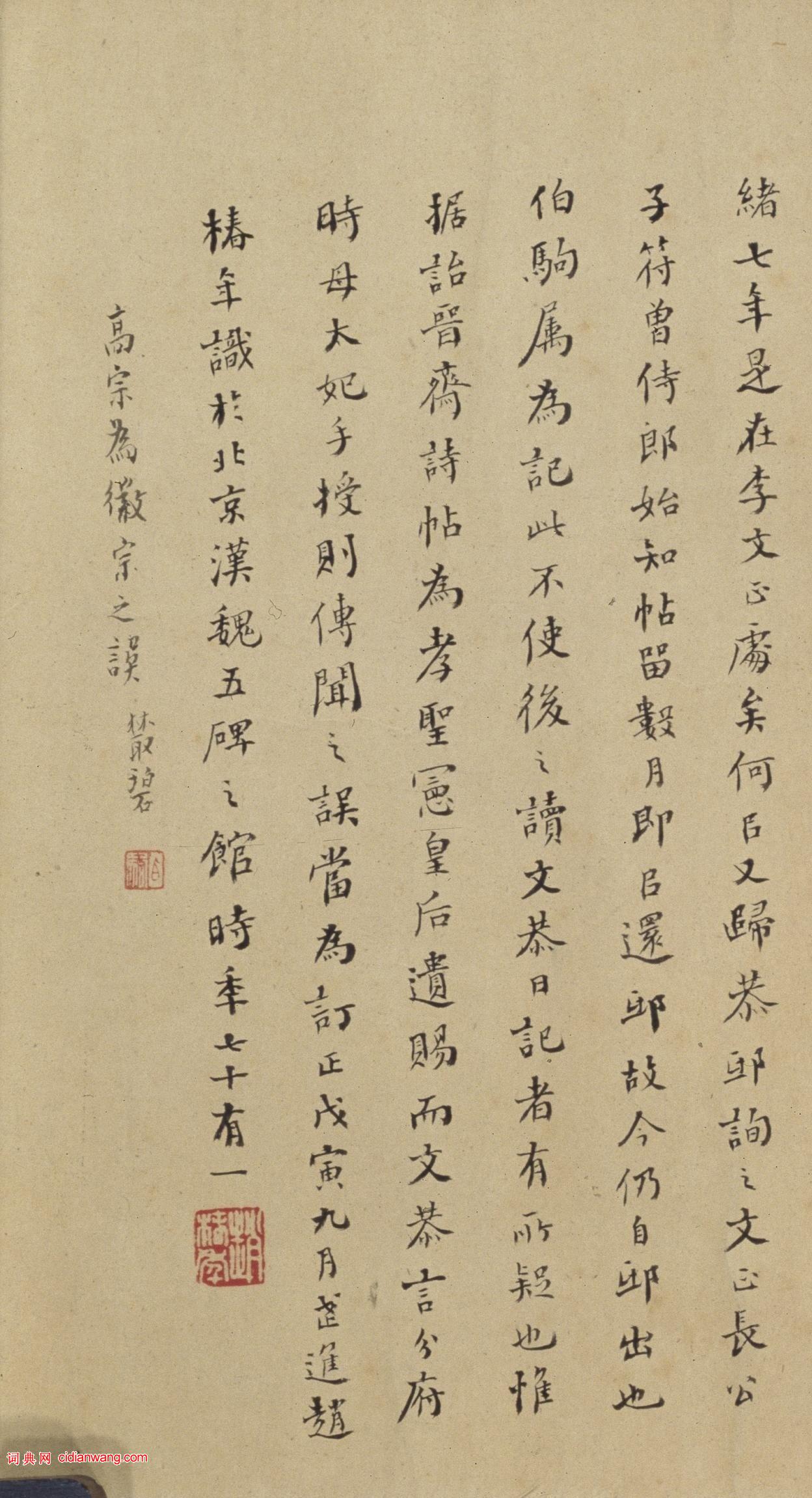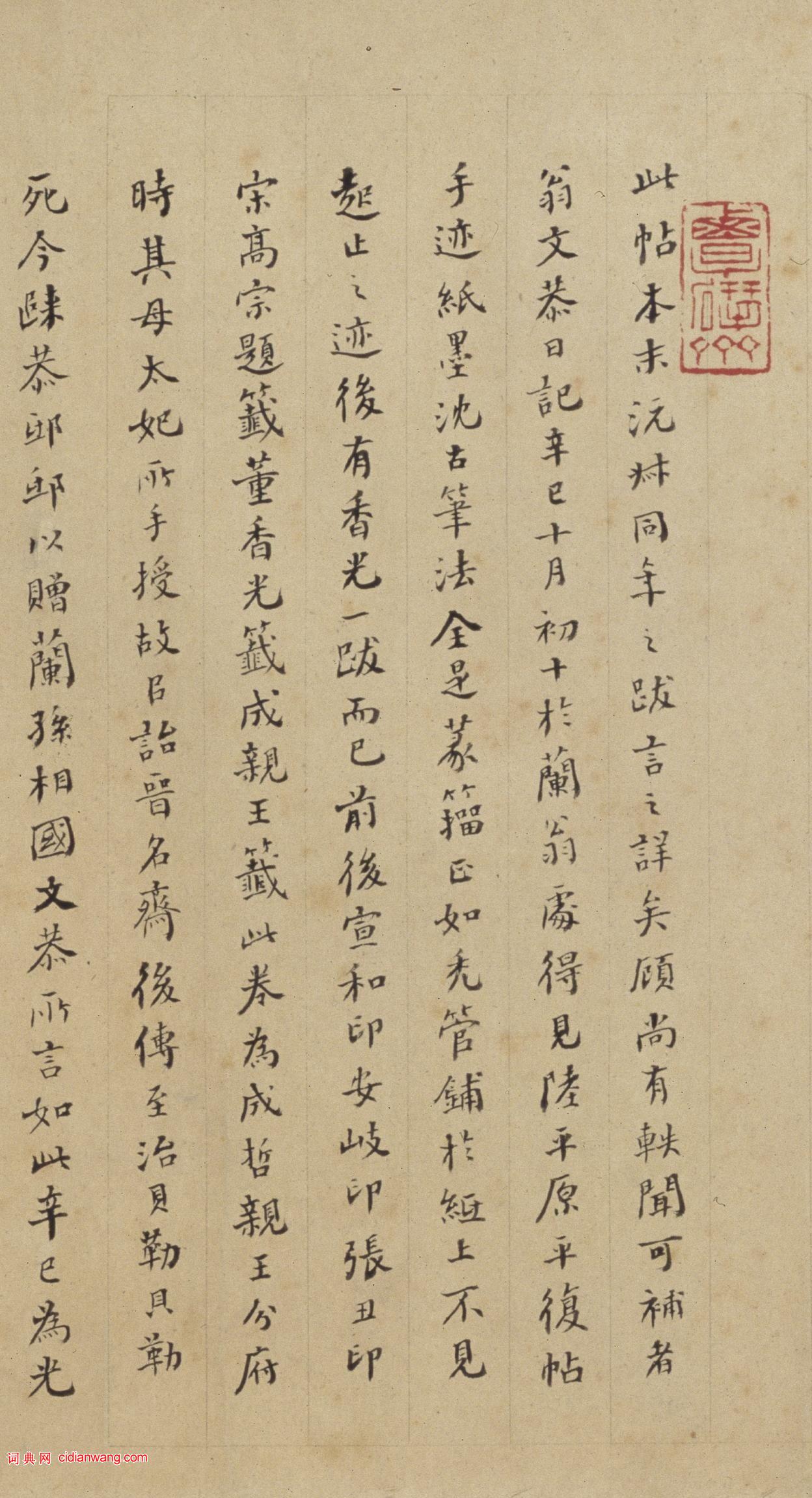 此帖本末沅叔同年之跋,言之詳矣。顧尚有軼聞可補者,翁文恭日記辛巳十月初十,於蘭翁處得見陸平遠《平復帖》手跡。紙墨瀋古,筆法全是篆籀,正如禿管鋪於紙上,不見起止之跡。後有香光一跋而已,前後宣和印、安岐印、張醜印、宋高宗題韱、董香光韱、成親王韱。此卷為成哲親王分府時,其母太妃所手授,故以治晉名齋後傳至治貝勒。貝勒死今 恭邸,邸以贈蘭孫相國,文恭所言如此。辛巳為光緒七年是在李文正處矣,何以又歸恭邸,詢之文正長公子符曾侍郎始知,帖留數月,即以還邸,故今仍自邸出也...