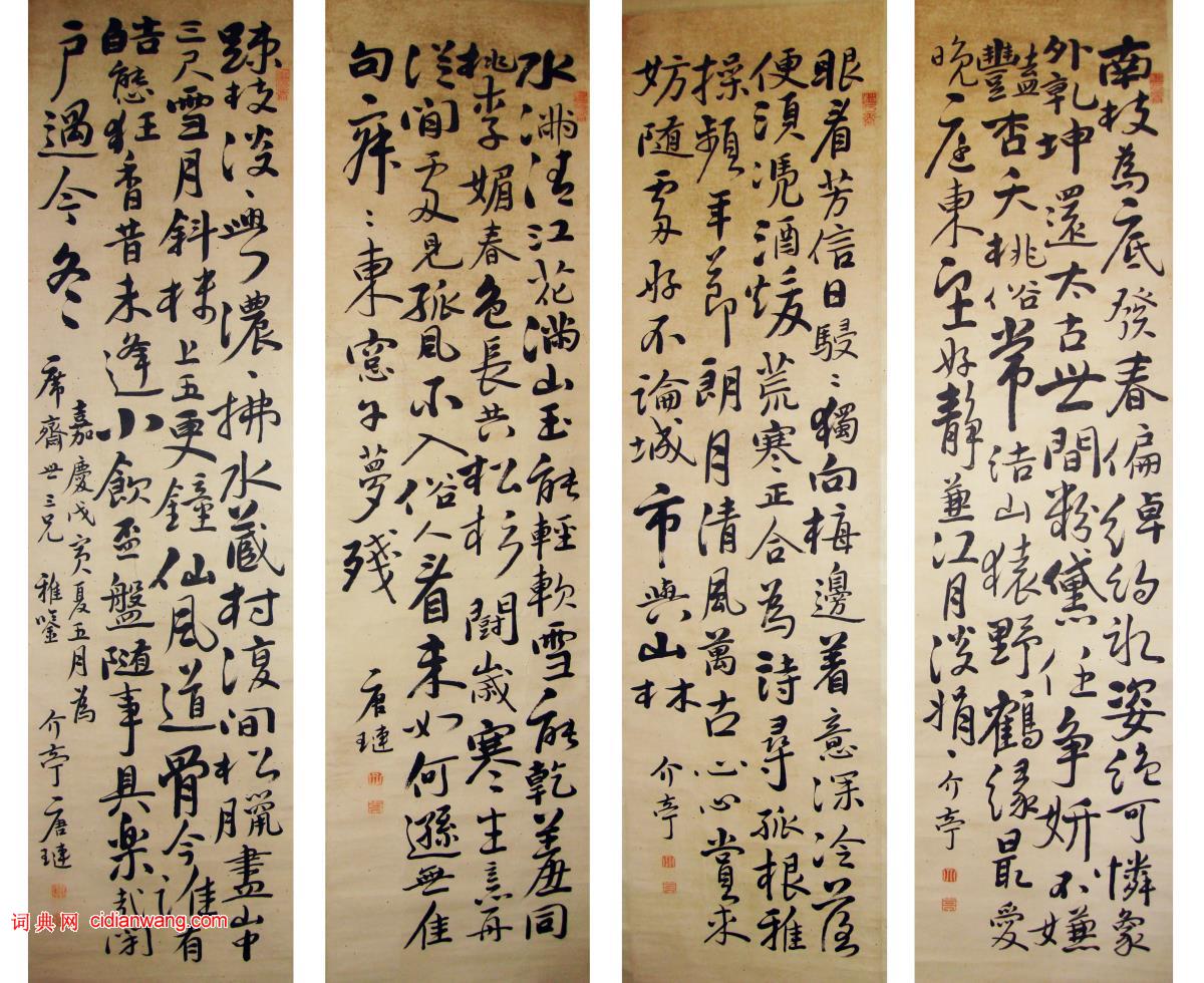 唐璉《行書四條屏》,紙本 ,書於嘉慶戊寅年(公元1818年)。,133cm×34cm×4 ,道不遠人私人收藏。