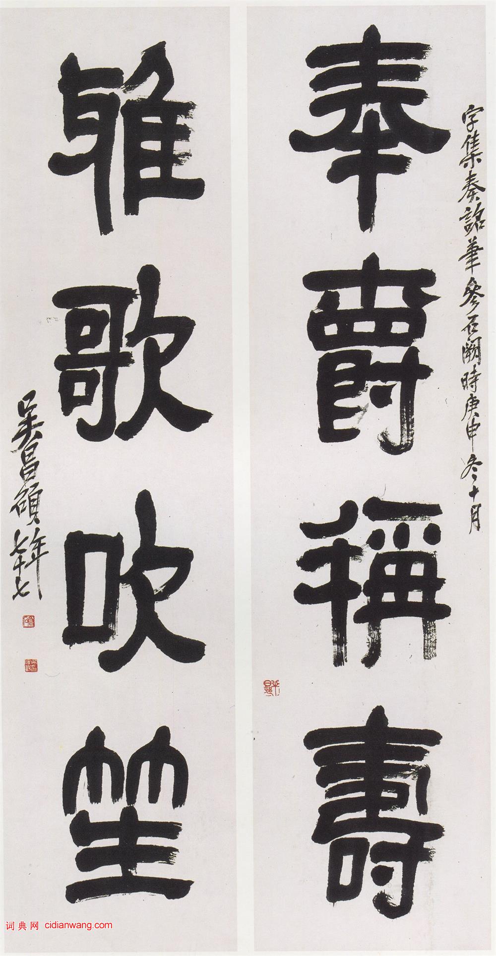 吳昌碩《隸書奉爵雅歌四言聯》 ,124×31cm×2, 書於1920年, 西泠印社藏。