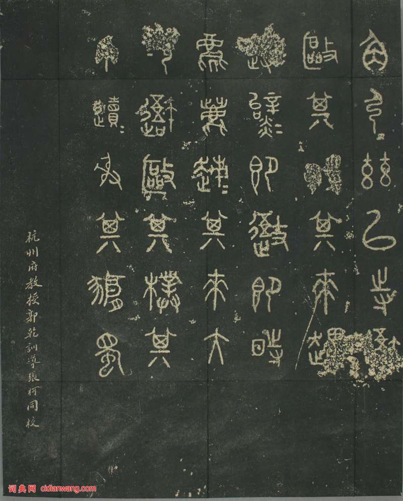石鼓文,秦刻石文字,因其刻石外形似鼓而得名。石鼓刻石文字多殘,北宋歐陽修錄時存四百六十五字,明代范氏天一閣藏本僅四百六十二字,而今之“馬薦”鼓已一字無存。原石現藏故宮博物院石鼓館。