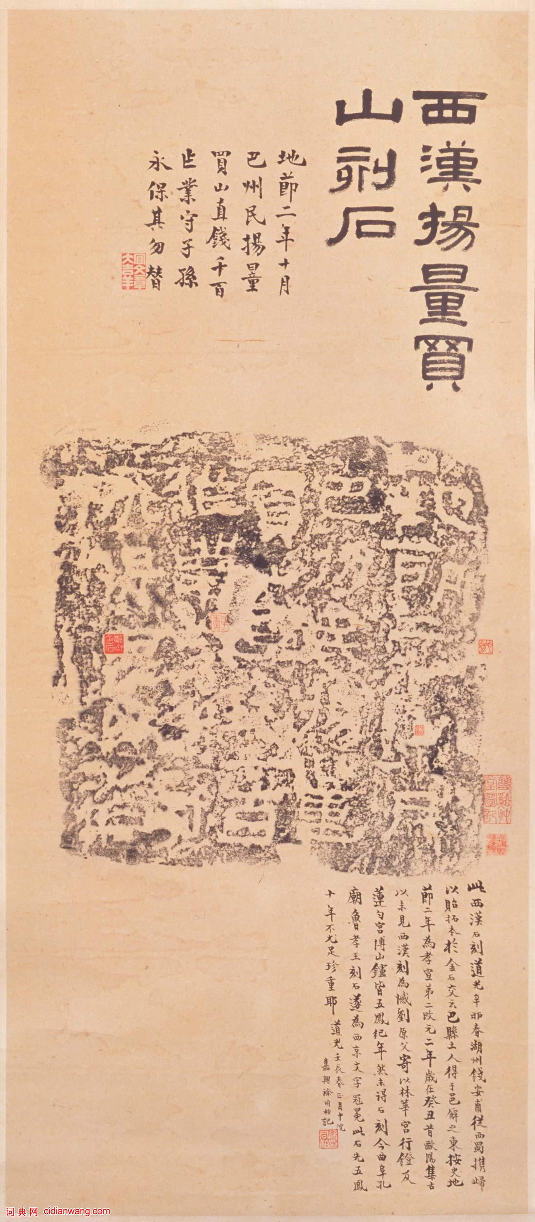 楊量買山地刻石,墨拓整紙本,已裱立軸。本幅縱119厘米,橫51.5厘米,其中有拓墨處約43厘米見方,上下余紙則為清人徐同柏於道光壬辰年(1832年)題寫的釋文及跋語,北京故宮博物院藏。