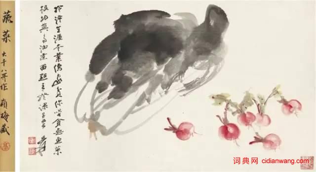 在這幅畫著蘿蔔白菜的作品裡,張大千寫了一首石濤的七絕:"冷淡生涯本業儒,家貧休厭食無魚。菜根切莫多油煮,留點清燈教子書。"綠纓紅頭的蘿蔔、鮮嫩青翠的白菜,此處已成寒士操守的象徵,配上那首詩,風骨自是越發崢嶸。