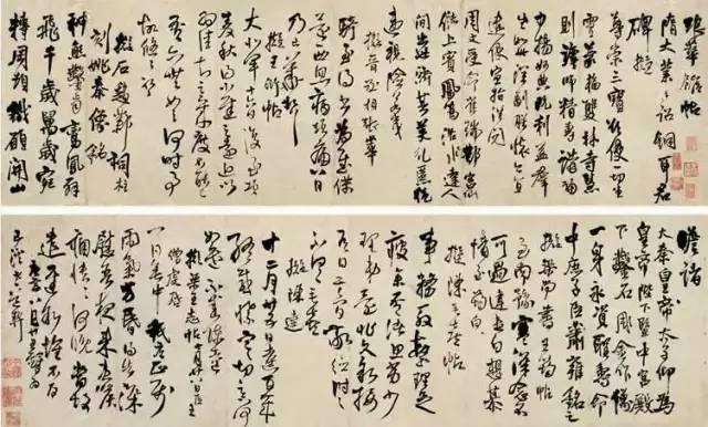 手卷是長的橫幅,不便於懸掛,只便於邊展開、邊觀賞、邊卷合,所以叫“手卷”,也叫“橫卷”或“長卷”。手卷的內容可以是—篇完整的文章,如《蘭亭序》、懷素《自敘帖》;可以是一首或一組 詩詞,如王鐸《行楷王維詩卷》。手卷也可以由同一作者多件獨立的作品連線而成,也可以由多個作者 的作品組合而成。手卷的尺寸,短的有幾米,長的有幾十米,高度一般為30至50厘米之間。手卷裝裱成 件,前有引首,可題字;後有題跋,可由多人作跋。
