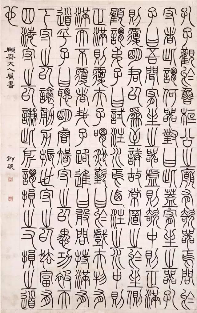 中堂的一半稱為斗方,其規格為正方形。後來不論大小,凡呈正方形的作品都可歸之為斗方。斗方這一形制出現較晚。隨著現代居室的牆面變矮變窄,在裝飾中,斗方作品越來越受到人們的歡迎。由於斗方四邊相等,增加了布局的難度,書寫時較難發揮,因為它既不像長卷有連綿千里之勢,也沒有條幅氣貫長虹之感。所以,我們在創作斗方作品時,要注意在這樣有限的空間、中庸的形式里製造出別樣的視覺效果,比如可以在空間對比、字型變化上多些考量。