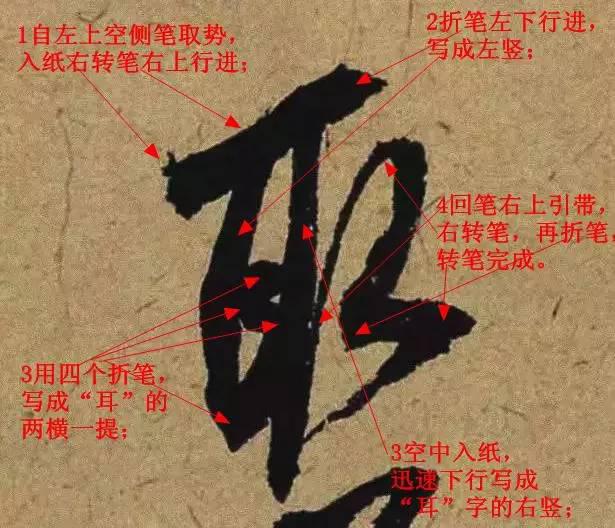 自左上空側筆取勢,入紙右轉筆右上行進,再折筆左下行進,寫成“耳”字的左豎;再提筆,用四個折筆,寫成“耳”字的兩橫一提;再空中入紙,迅速下行寫成“耳”字的右豎,再迴避右上引帶,右轉筆,再折筆,轉筆完成“取”字。