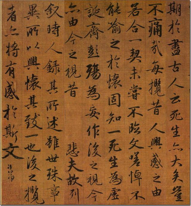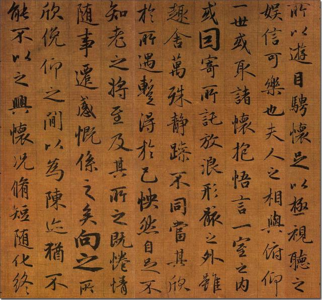 《蘭亭序》全文:永和九年,歲在癸丑,暮春之初,會於會稽山陰之蘭亭,修禊事也。群賢畢至,少長鹹集。此地有崇山峻岭,茂林修竹;又有清流激湍,映帶左右,引以為流觴曲水,列坐其次。雖無絲竹管弦之盛,一觴一詠,亦足以暢敘幽情。是日也,天朗氣清,惠風和暢,仰觀宇宙之大,俯察品類之盛,所以遊目騁懷,足以極視聽之娛,信可樂也。夫人之相與,俯仰一世,或取諸懷抱,晤言一室之內;或因寄所託,放浪形骸之外。雖取捨萬殊,靜躁不同,當其欣於所遇,暫得於己,快然自足,不知老之將至。及其所之既倦,情隨事遷,感慨系之矣。向之所欣,俯仰之間,已為陳跡,猶不能不以之興懷。況修短隨化,終期於盡。古人云:“死生亦大矣。”豈不痛哉!每覽昔人興感之由,若合一契,未嘗不臨文嗟悼,不能喻之於懷。固知一死生為虛誕,齊彭殤為妄作。後之視今,亦猶今之視昔。悲夫!故列敘時人,錄其所述,雖世殊事異,所以興懷,其致一也。後之覽者,亦將有感於斯文。