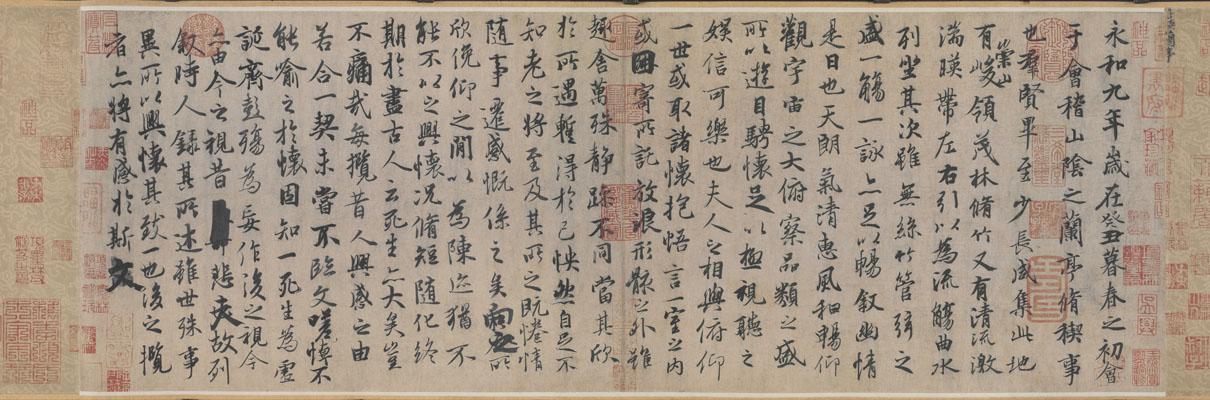 《蘭亭序》是永和九年(353年)三月初三王羲之為蘭亭雅集所撰寫的一篇序文。是日也,王羲之與謝安、孫綽等41位文人雅士到山陰蘭亭(今浙江紹興)行“修楔”之禮,以除晦氣。大家在“崇山峻岭、茂林修行”、“清流激湍”、“天朗氣清、惠風和暢”的優雅環境中暢敘幽情,飲酒作詩26首,眾人公推王羲之為此次雅集作序。書聖乘著酒興,用鼠須筆在蠶繭紙上一揮而就,一件千古傑作就在不經意之間誕生了。《蘭亭序》不光是書法史上的傑作,也是文學史上的一篇美文,作品的藝術格調和文學意境相得益彰,歷代書家莫不頂禮膜拜。