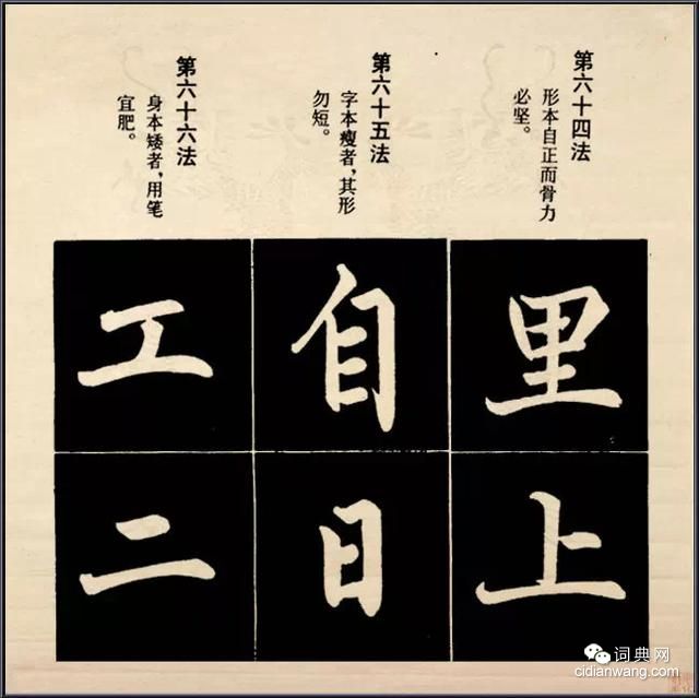 65,字本瘦者,其形勿短 字本來就瘦的,字形不要寫得太短。如:身、目、耳、貝;