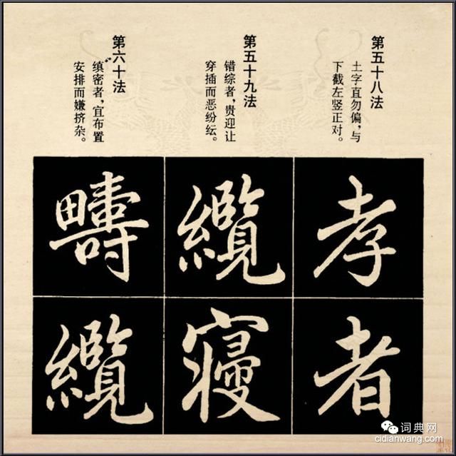 59,錯綜者,貴迎讓穿插而惡紛紜 結構錯綜複雜的字,要穿插對應退讓,但不能亂。如:繁、馨