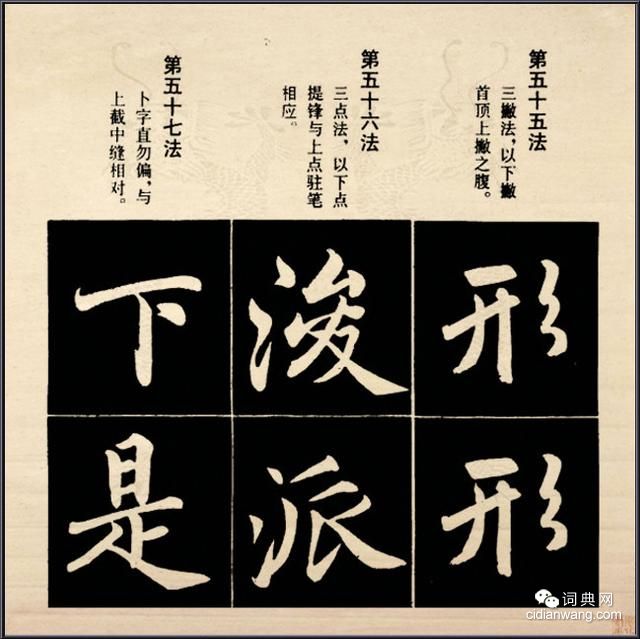 55,三撇法,以下撇首,頂上撇之腹 連著三撇的字,下撇應依次頂著上撇的中間。如;修、參、須、形