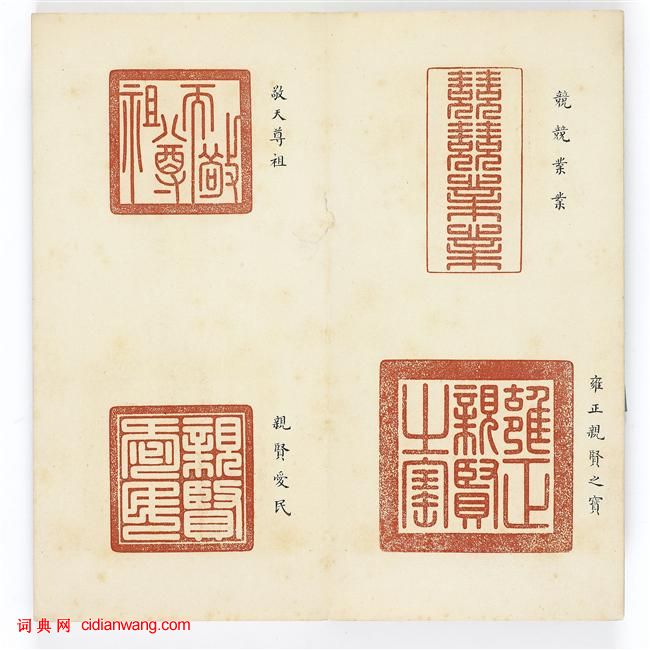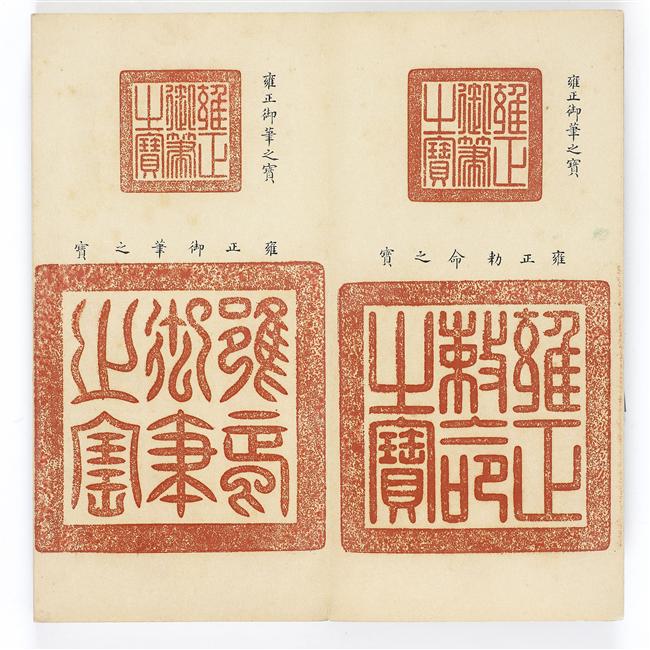 書法欣賞魏晉書法唐朝書法宋朝書法元朝書法明朝書法清朝書法近現代書法字典網>> 歷代書法>> 書法欣賞>> 寶璽印存《雍正寶藪》篆刻精品(2)正文 寶璽印存《雍正寶藪》篆刻精品(2)作者:不詳 書體:字典網 左上:雍正御筆之寶右上:雍正御筆之寶左下:雍正御筆之寶右下:雍正敕命之寶(圖片上是繁體字“勅”) 左上:敬天尊祖右上:兢兢業業左下:親賢愛民右下:雍正親賢之寶 首 頁 上一頁 1 2 3 4 5 6 7 8 9 10 下一頁 尾 頁相關文章:董其昌行書《大唐中興頌》 (行書)《大唐中興頌》系唐代大詩人元次山(結)所撰,由唐代大書家顏真卿用楷書大字所寫,鐫...唐寅行書《七律四首詩卷》 (行書)唐寅《行書七律四首詩卷》紙本行書 23×286cm 天津博物館藏釋文:聞太原閣...趙佶楷書《題歐陽詢張翰帖後跋》 (楷書)趙佶《題歐陽詢張翰帖後跋》 縱25.1cm 北京故宮博物院藏釋文:唐太子率更令歐...索靖章草《皋陶帖》 (草書)索靖《皋陶帖》,宋拓《淳化閣帖》卷三,拓本墨紙,縱25.2cm,橫13.1cm(...成親王小楷《群仙高賦會》 (小楷)和碩成親王,清朝世襲親王。乾隆五十四年(1789年),乾隆帝皇十一子永瑆封親王,...王羲之草書《漢時帖》 (草書)《漢時帖》前二行為唐人寫本,後段為元趙孟頫補書。按《漢時帖》為王羲之《十七帖》中...趙之謙《書古人句四條屏》 (楷書)趙之謙《書古人句四條屏》紙本 165×44cm×4 西泠印社藏 釋文: 屏一...趙孟頫《雪岩和尚拄杖歌卷》 (行書)趙孟頫《雪岩和尚拄杖歌卷》,紙本,縱23.5cm,橫53.6cm。原卷25cm×...趙孟頫·後赤壁賦 (行書)趙孟頫書後赤壁賦,紙本,冊裝,共11開21頁,每頁縱:27.2厘米,橫:11.1...陳基行書《致伯升廷玉札》 (行書)陳基,字敬初,台州臨海(今浙江)人,寓居吳中鳳凰山河陽里(今屬張家港市)。元末江...