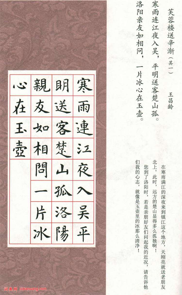 書法欣賞魏晉書法唐朝書法宋朝書法元朝書法明朝書法清朝書法近現代書法字典網>> 歷代書法>> 書法欣賞>> 虞世南楷書集字唐詩(13)正文 虞世南楷書集字唐詩(13)作者:不詳 書體: 王昌齡·芙蓉樓送辛漸(其一) 首 頁 上一頁 9 10 11 12 13 14 15 16 17 18 下一頁 尾 頁相關文章:王守仁《行書唐人秋閨思一首詩軸》 (行書)王守仁《行書唐人秋閨思一首詩軸》紙本行書 212×72.5cm 上海朵雲軒藏釋...馮文蔚小楷臨《九成宮》 (小楷)用硬筆臨摹傳統的毛筆書法字帖,很少有合適的選擇。很多書友擅長硬筆書法,又想向歐楷...趙令畤·跋懷素自敘帖 (行書)【釋文】令畤夏日與 劉延仲呂辯老過 都統太尉王公,觀法書 名畫,如行山陰道上,映...西周金文《散氏盤》書法 (篆書)《散氏盤》又名《散盤》,西周晚期金文,19行,350字。現藏台北故宮博物院。內容...譚延闓《行書臨米芾詩四條屏》 (行書)譚延闓《行書臨米芾詩四條屏》紙本行書 165×36cm×4 常州博物館藏(1...趙孟頫《江南淨土詞十二首》 (行書)至元二十三年(1286年),行台侍御史程鉅夫“奉詔搜訪遺逸於江南”,將趙孟頫引見...倪瓚楷書《呈履道先生詩札》 (楷書)倪瓚《呈履道先生詩札》,紙本,楷書, 香港中文大學藏 釋文:(七)瓚□,月末得■...法若真行書《七言詩軸》 (行書)法若真《行書七言詩軸》綾本行書 195×51cm 山東省博物館藏釋文:兩控山城...金運昌.乾隆題畫詩 (隸書)釋文:茅齋幾架碧溪邊,拂鬢天風意欲仙。松韻湍聲相問答,高人屬耳似聽禪。...文徵明《跋右軍十七帖》 (楷書)文徵明《跋右軍十七帖》,楷書。《十七帖》為書聖王羲之的草書代表之作,不過原跡早已...
