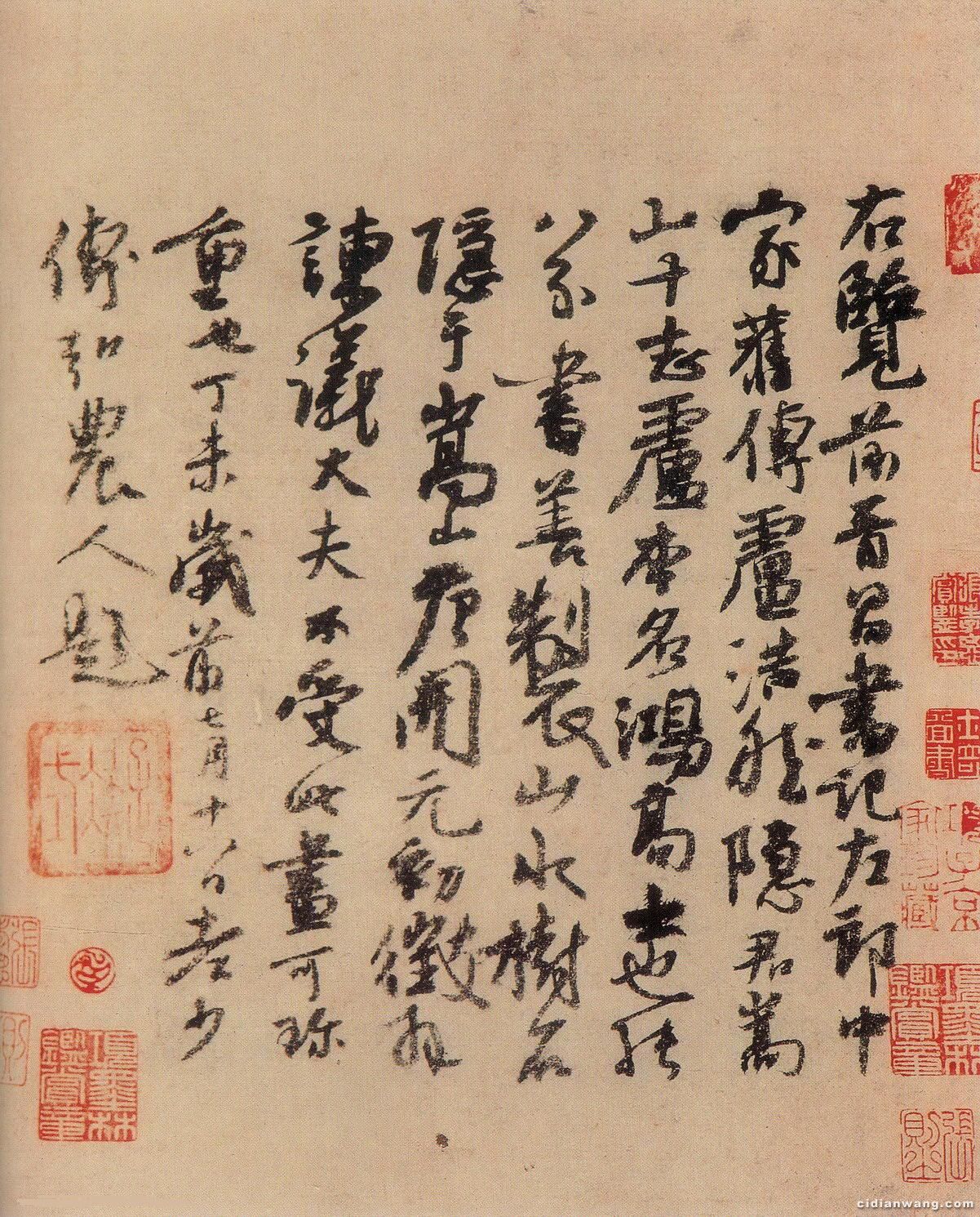 書風體貌受顏真卿行書影響比較大,筆力沉練,曠達有度。此為圖跋,一般受制於圖之框架,故楊之法書盡在法度規矩之內。清劉熙載《書概》云:“景度書機括本出於顏,而加以不衫不履,遂自成家”。
