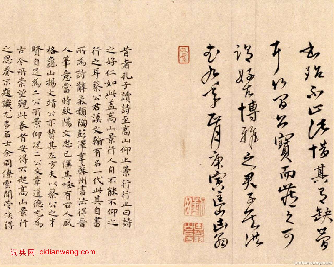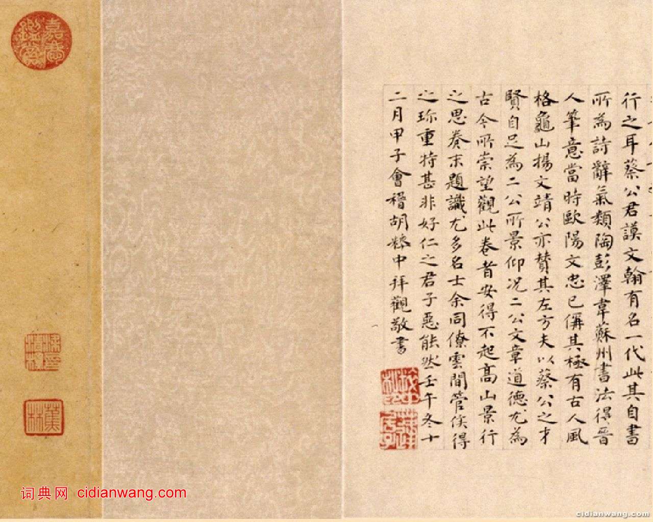 "昔者孔子讀詩,至高山仰止,景行行止曰:詩之好仁如此。蓋高山景行,人自不能不仰之行之耳。蔡公君謨文翰有名一代,此其自書所為詩,辭氣類陶彭澤、韋蘇州。書法得晉人筆意,當時歐陽文忠已稱其極有古人風格,龜山楊文靖公亦贊其左方。夫以蔡公之才賢自足為二公所景仰,況二公文章道德尤為古今所崇望,觀此卷者安得不起高山景行之恩。卷末題尤多名士。余同僚竹間管候得之珍重特甚,非好仁之君子惡能然。壬午冬十二月甲子會稽胡粹中拜觀敬書。"