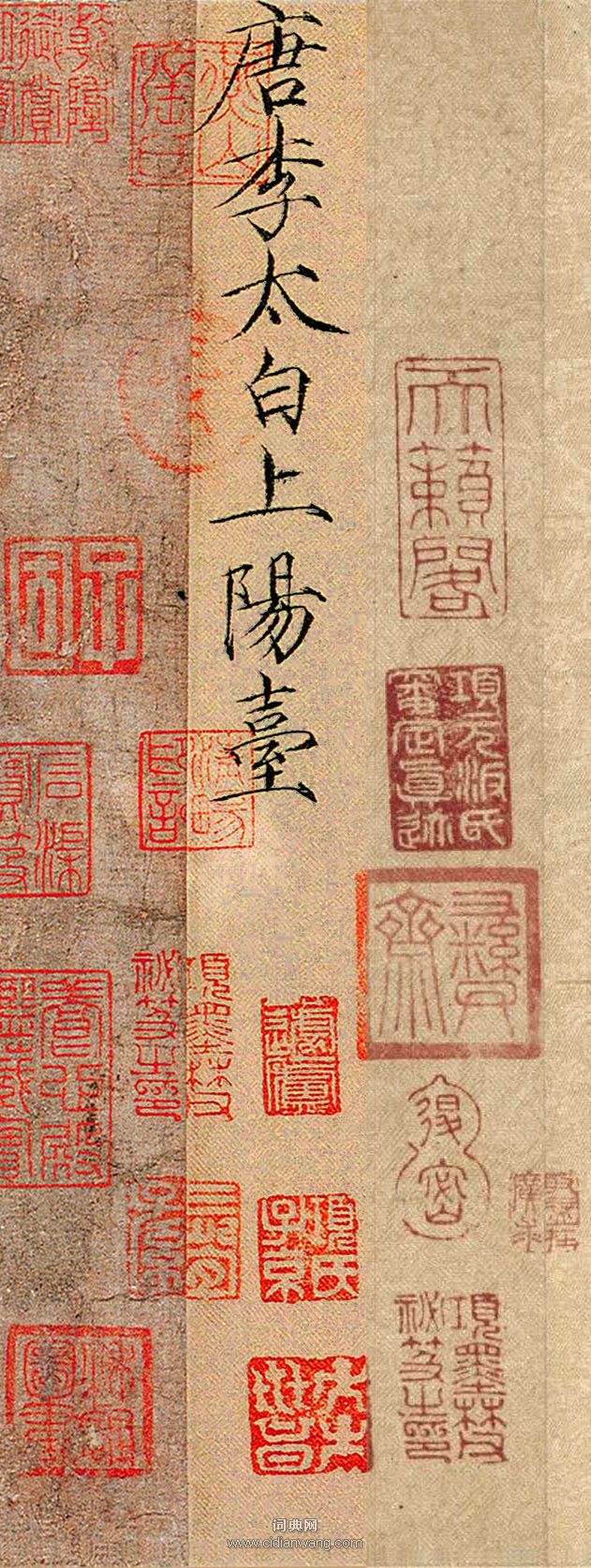 《上陽台帖》是李白傳世的唯一書跡,歷來收藏於內府,正文右上宋徽宗趙佶題簽:“ 唐李太白上陽臺”一行。後紙有宋徽宗趙佶題跋。皆為瘦金書,極其工整秀雅,可見徽宗對李白書跡之膜拜。 題簽:唐李太白上陽台