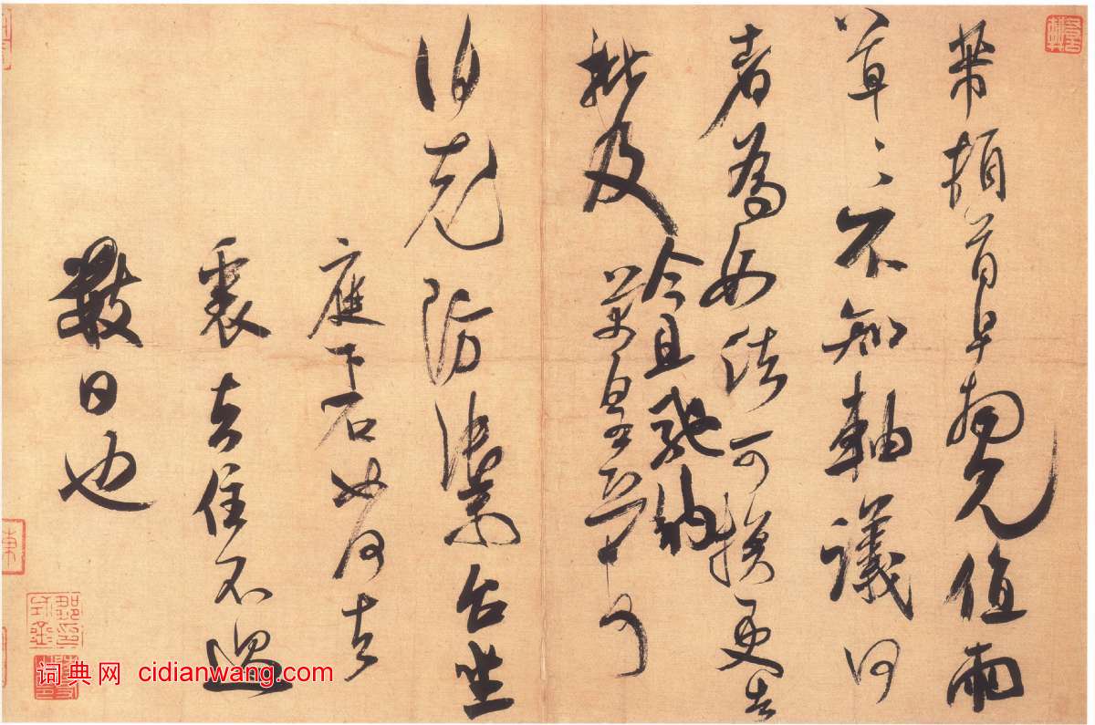 書法欣賞魏晉書法唐朝書法宋朝書法元朝書法明朝書法清朝書法近現代書法字典網>> 歷代書法>> 宋朝>> 米芾《值雨帖》正文 米芾《值雨帖》作者:米芾 書體:行書 【釋文】芾頓首。早拜見。值雨。 草草。不知軸議何 者為如法。可換更告 批及。今且馳納。芾皇(惶)恐頓首。 伯充防禦台坐。 庭下石如何去 里。去住不過 數日也。 米芾《值雨帖》行書。紙本。縱25.6厘米,橫38.6厘米。台北故宮博物院藏。信札一則。約書於北宋徽宗崇寧二年(1103)。1 2 下一頁 尾 頁 全文2015-5-8 13:02:55 米芾的相關書法作品:米芾行書《叔晦帖》 米芾《惡札帖》 米芾·戲成詩帖 米芾《惠柑帖》 米芾·蘇太簡參政帖 米芾·向太后輓詞帖 米芾《行書建州帖》 米芾·三吳詩帖 米芾·褚臨黃絹本蘭亭序跋贊 相關文章:康里巎巎草書《李白古風詩卷》 (草書)草書詩書卷之《李白古風詩卷》 紙本 35.0×63.8cm 點擊瀏覽大圖 ...唐寅行書《七律詩軸》龍頭獨對五千文 (行書)唐寅《行書七律詩軸》 縱146.5厘米 橫36.2厘米 蘇州博物館藏圖片來自《...蘇軾行書《次韻秦太虛見戲耳聾詩帖》 (行書)蘇軾《次韻秦太虛見戲耳聾詩帖》,行書,台北故宮博物院藏。【釋文】君不見詩人借車無...吳玉如《行書札記》 (行書)吳玉如《行書札記》 釋文:略 款識:迂叟寫付嘉祥存玩。 【資料來源】《書法》雜誌...祝允明楷書《燕喜亭等四記》 (楷書)祝允明楷書《燕喜亭等四記》卷(局部) 紙本 20.5×201.1厘米 北京故宮...王羲之草書《七月帖》 (草書)王羲之《七月帖》又名《秋月帖》,草書,台北故宮博物院藏作品,紙本。釋文:七月一日...趙明誠·題歐陽修《集古錄跋》 (行書)【釋文】右歐陽文忠公集古錄跋尾四。崇寧五年(1106)仲春重裝。十五日德父題記。...趙孟頫·跋王羲之《時雪快晴帖》 (行書)趙孟頫跋王羲之《時雪快晴帖》,行書。台北故宮博物院藏。釋文:東晉至今近千年,書跡...王鐸草書《為葆光張老親翁書》詩卷 (草書)王鐸草書《為葆光張老親翁書》詩卷 1065年作 縱30厘米 橫364.5厘米 北...瘞鶴銘 (楷書)《瘞鶴銘》殘片焦山摩崖石刻《瘞鶴銘》刻於南朝·梁(傳)天監十三年(514年),...