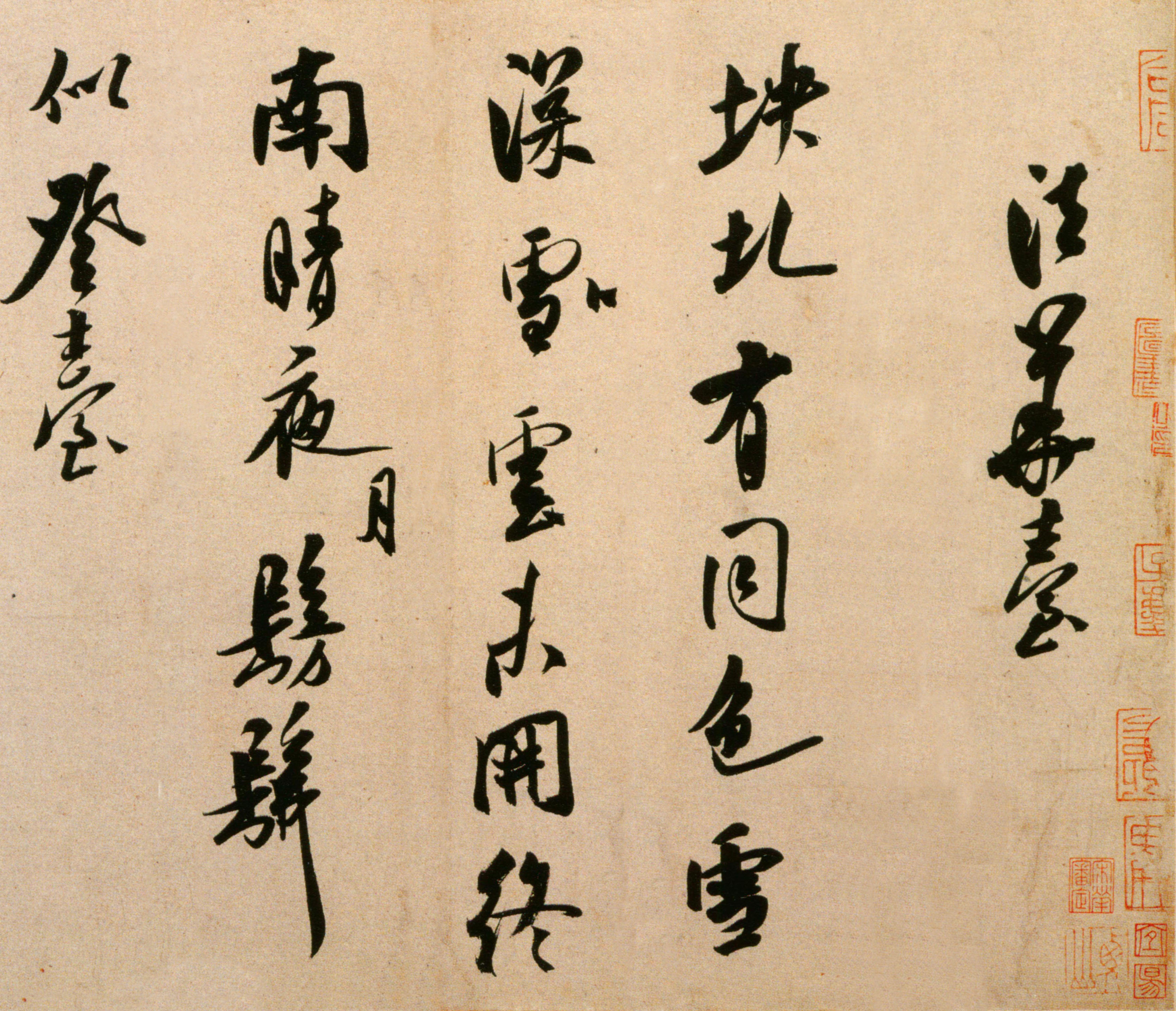 書法欣賞魏晉書法唐朝書法宋朝書法元朝書法明朝書法清朝書法近現代書法字典網>> 歷代書法>> 宋朝>> 米芾《法華台詩帖》正文 米芾《法華台詩帖》作者:米芾 書體:行書 【釋文】法華台。塊圠有同色,雪深雲未開。終南晴夜月,仿佛似登台。米芾《法華台詩帖》,紙本,行書,縱29.8厘米,橫42厘米。北京故宮博物院藏。米芾的相關書法作品:米芾《紫金研帖》 米芾草書《吾友帖》 米芾《來戲帖》 米芾行書《天馬賦》版本二 米芾《行書建州帖》 米芾墨跡十三帖 故宮珍藏! 米芾行書《自敘帖》 米芾小楷《千字文》 米芾草書《臈白帖》 相關文章:吳雯《行書過河上道院五言詩軸》 (行書)吳雯《行書過河上道院五言詩軸》紙本行書 149.2×46.6cm 湖南省博物館...伊秉綬隸書《從來可以五言聯 》 (隸書)隸書五言聯 設色紙本 拍賣作品 101×25cm×2 ...釋擔當《七言詩句立軸》 (草書)釋擔當《七言詩句立軸》紙本草書 121.7×30.4cm 雲南省博物館藏釋文:...彭睿壦行草《岑參詩軸》 (行草)彭睿壦《行草岑參詩軸》 廣州市美術館(現廣州藝術博物院)藏釋文:今年花似去年好,...趙世駿楷書臨《褚遂良雁塔聖教序》 (楷書)趙世駿楷書欣賞臨《褚遂良雁塔聖教序》趙氏所處時代,是書風丕變的急轉期。康有為持論...米芾·戲成詩帖 (行書)【釋文】戲成呈司諫台坐,芾。我思嶽麓抱黃閣,飛泉元在半天落。石鯨吐水(點去)出湔...啟功題字書法集錦 (行書)“啟功先生書法,法度森嚴,結體精謹婉妙,用筆妙到毫顛,氣息清雅恬淡。小字尤勝,題...唐楷書《等慈寺碑》 (楷書)全稱《大唐皇帝等慈寺之碑》。唐顏師古撰。無書人姓名。無立碑年月。宋趙明誠《金石錄...陳基《賢郎帖》 (行草)元 陳基 《賢郎帖》 紙本,北京故宮博物院藏。 陳基(1314—1370年),字...陸師道·題仇英《仙山樓閣圖》 (楷書)【釋文】仙山賦。馳藻思兮何間關。搆圖繪兮非人間。將神遊之恍惚兮。抑倒景之曾攀。山...